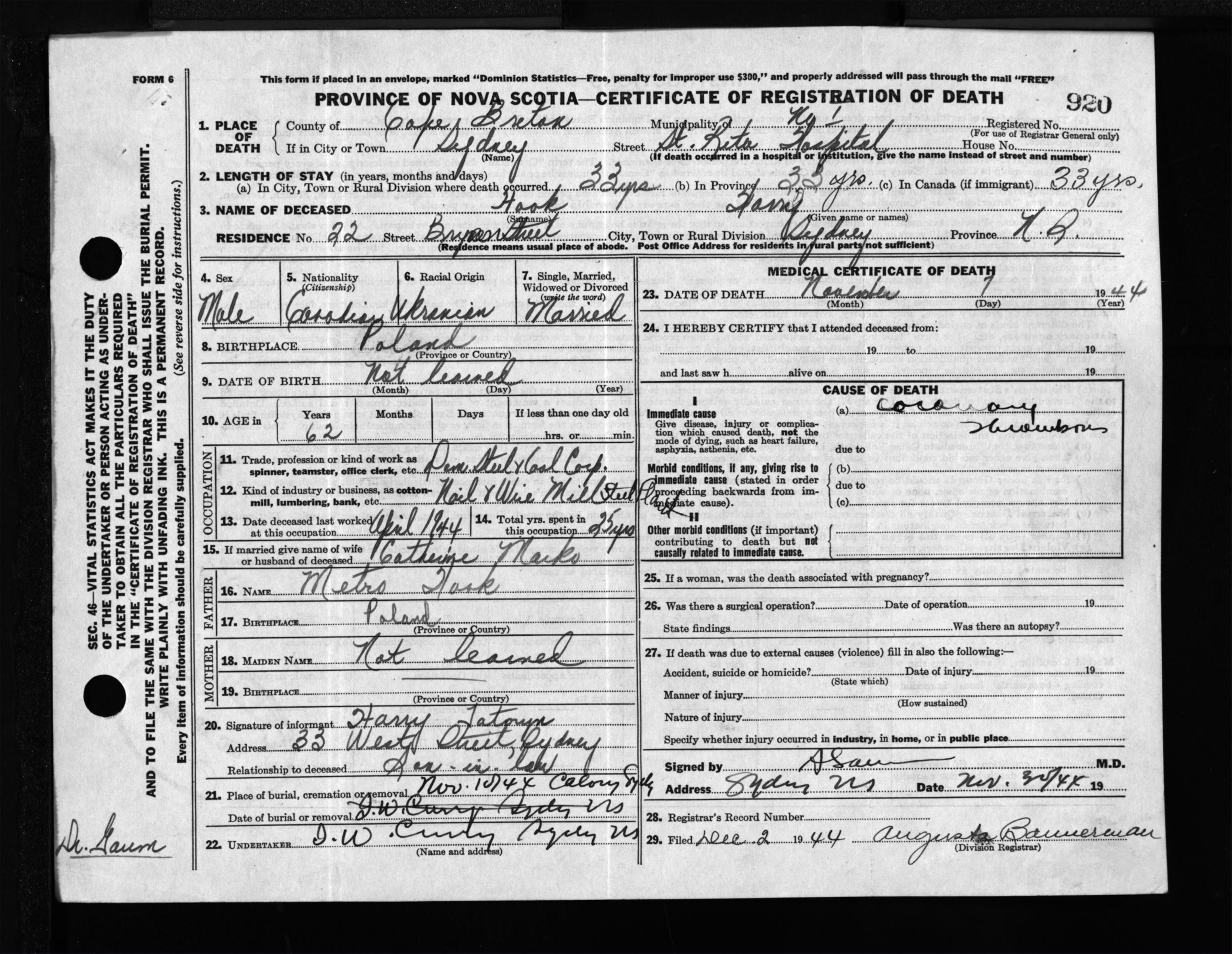Male Death Registration: Year: 1944 file: 217 number: 920