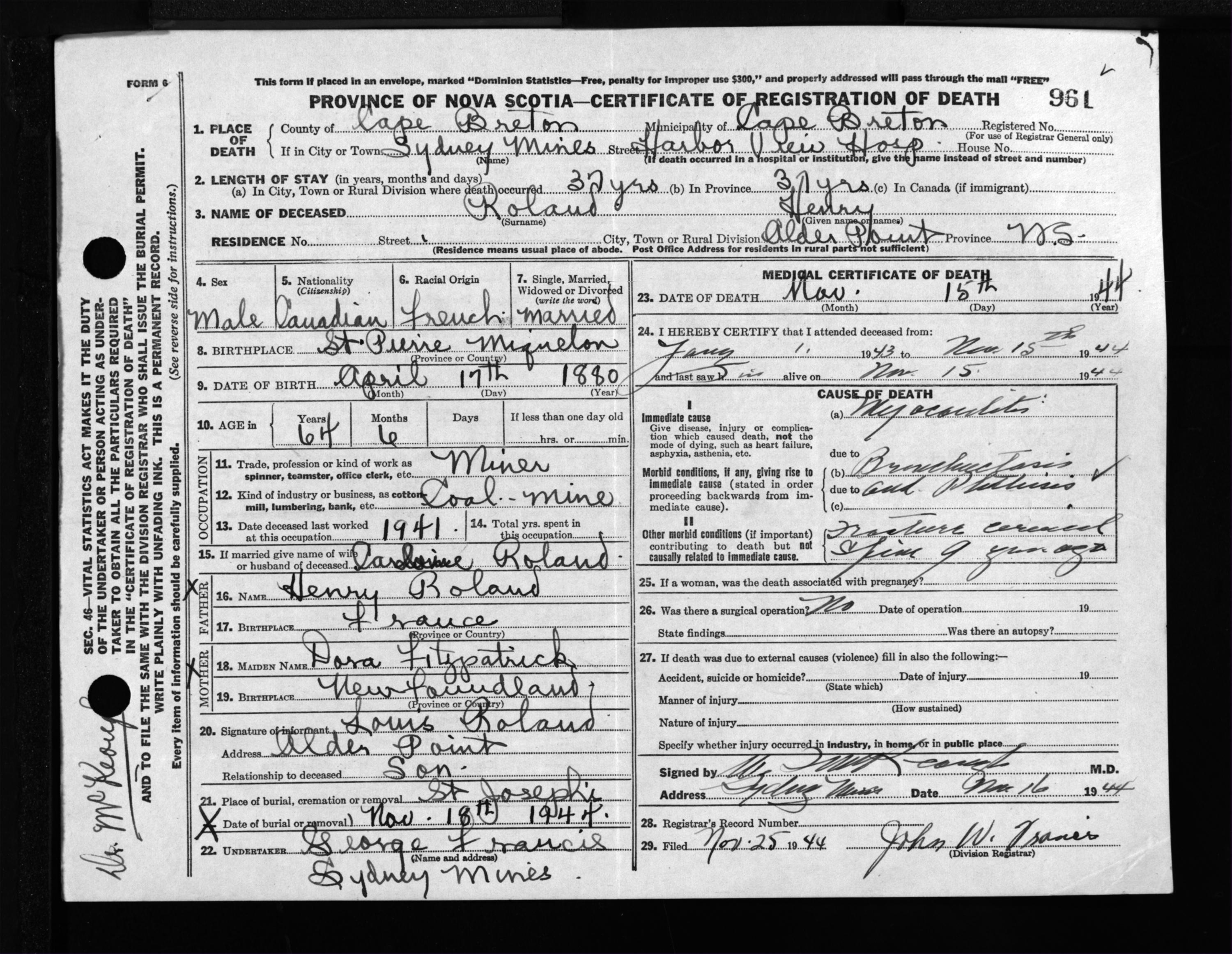 Male Death Registration: Year: 1944 file: 217 number: 961