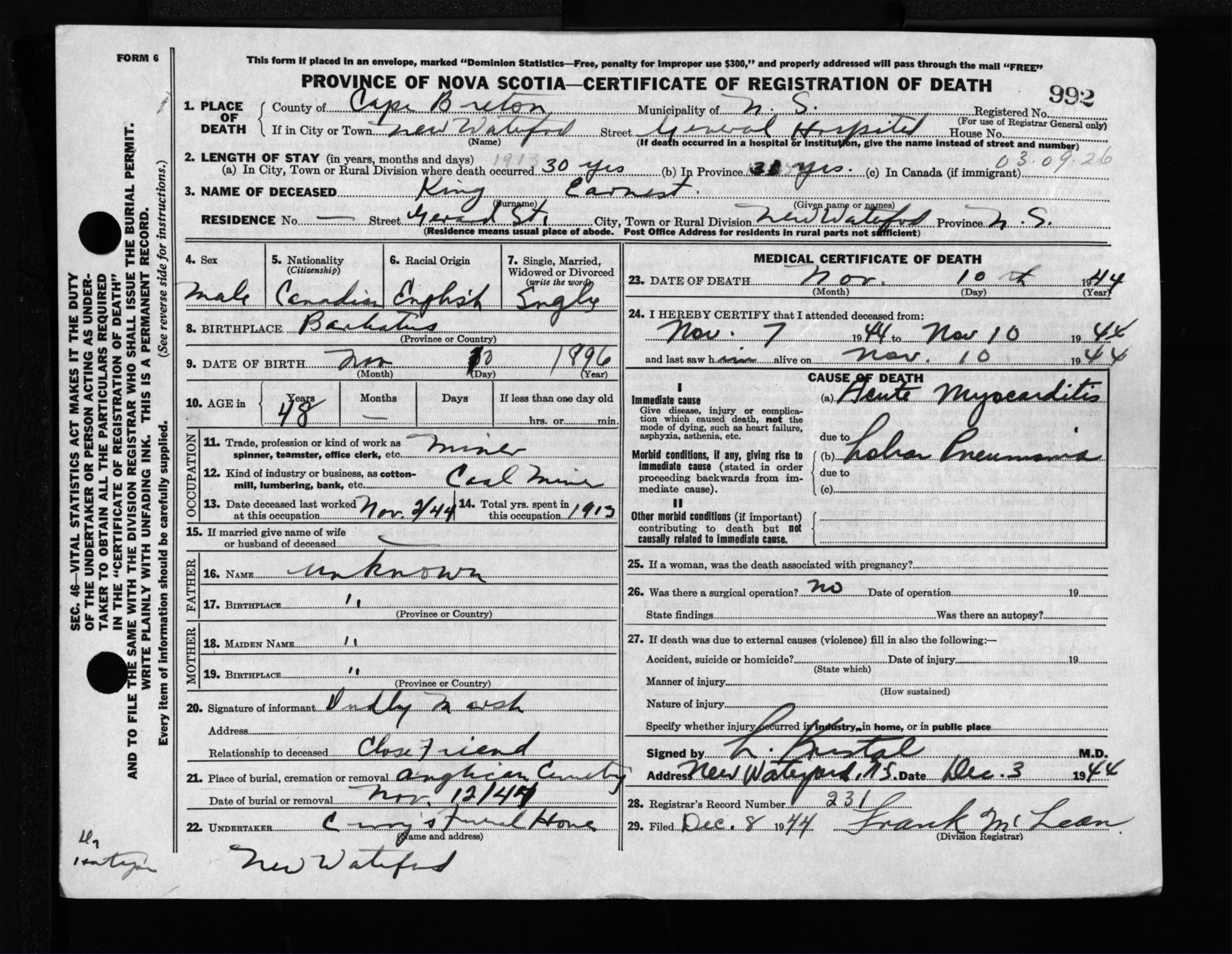 Male Death Registration: Year: 1944 file: 217 number: 992