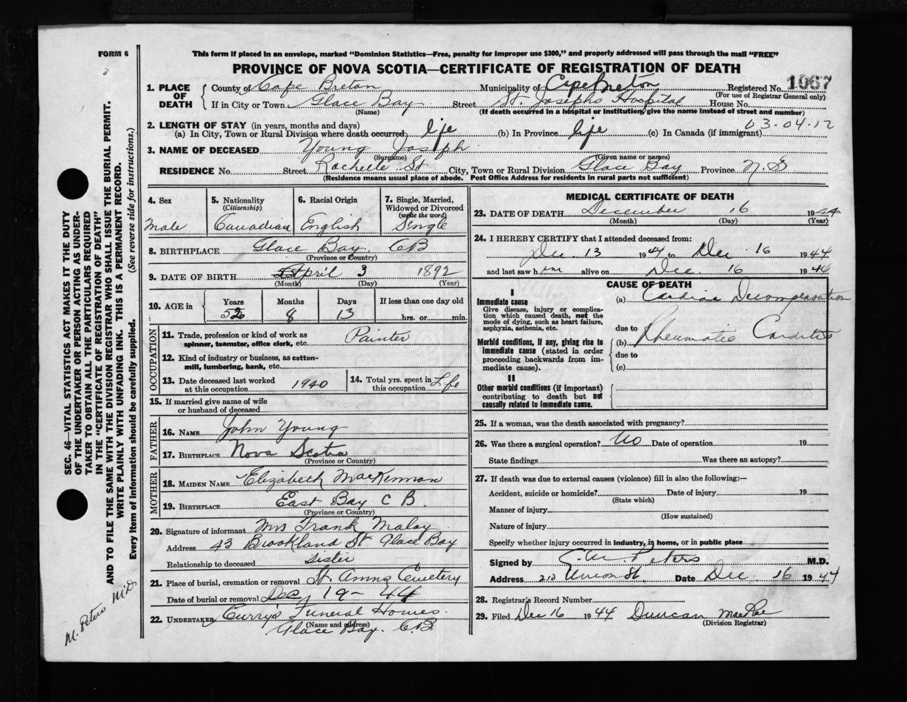 Male Death Registration: Year: 1944 file: 217 number: 1067