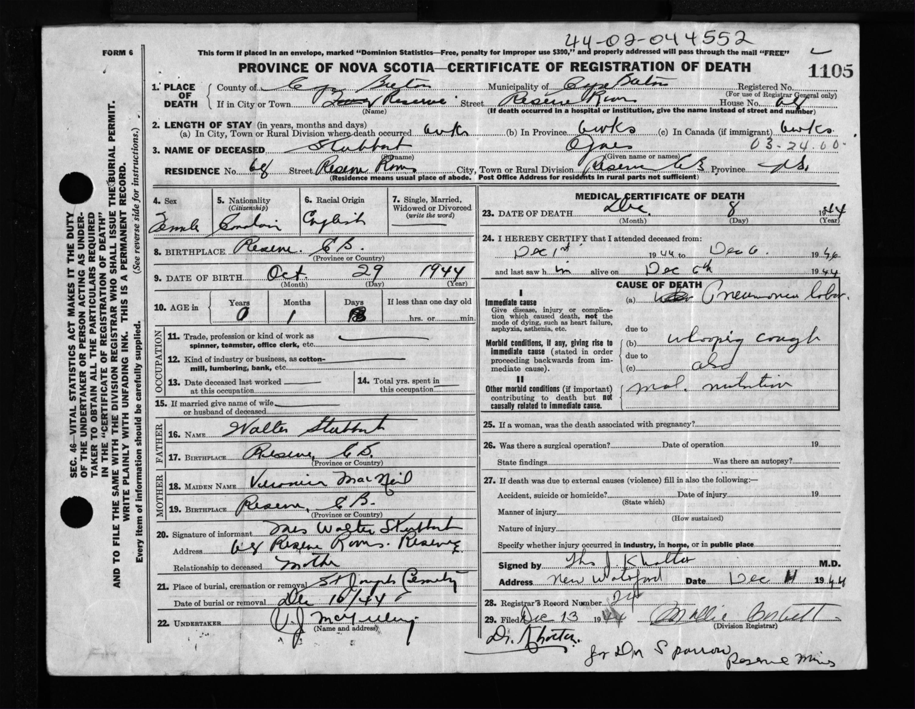 Female Death Registration: Year: 1944 file: 217 number: 1105