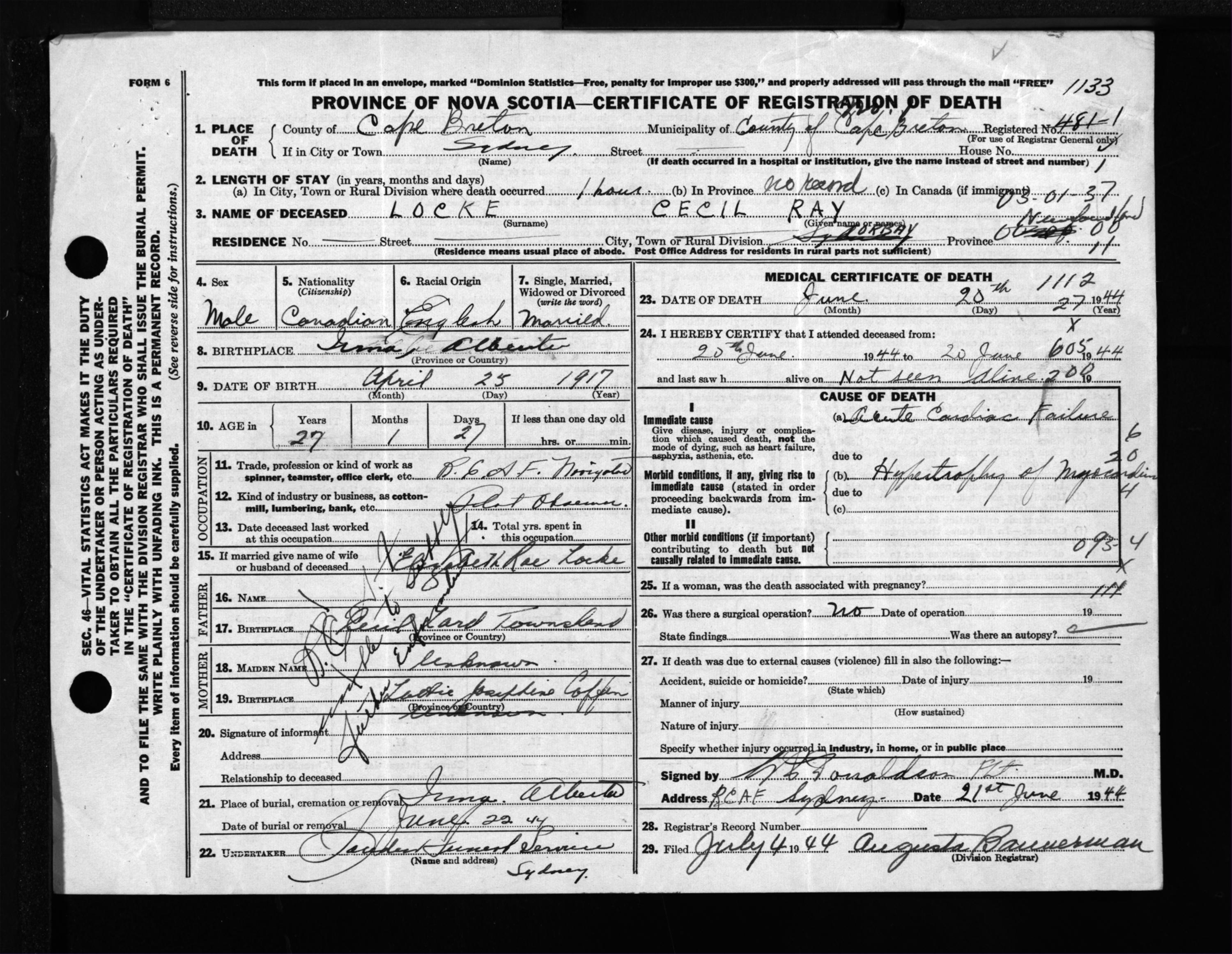 Male Death Registration: Year: 1944 file: 217 number: 1133