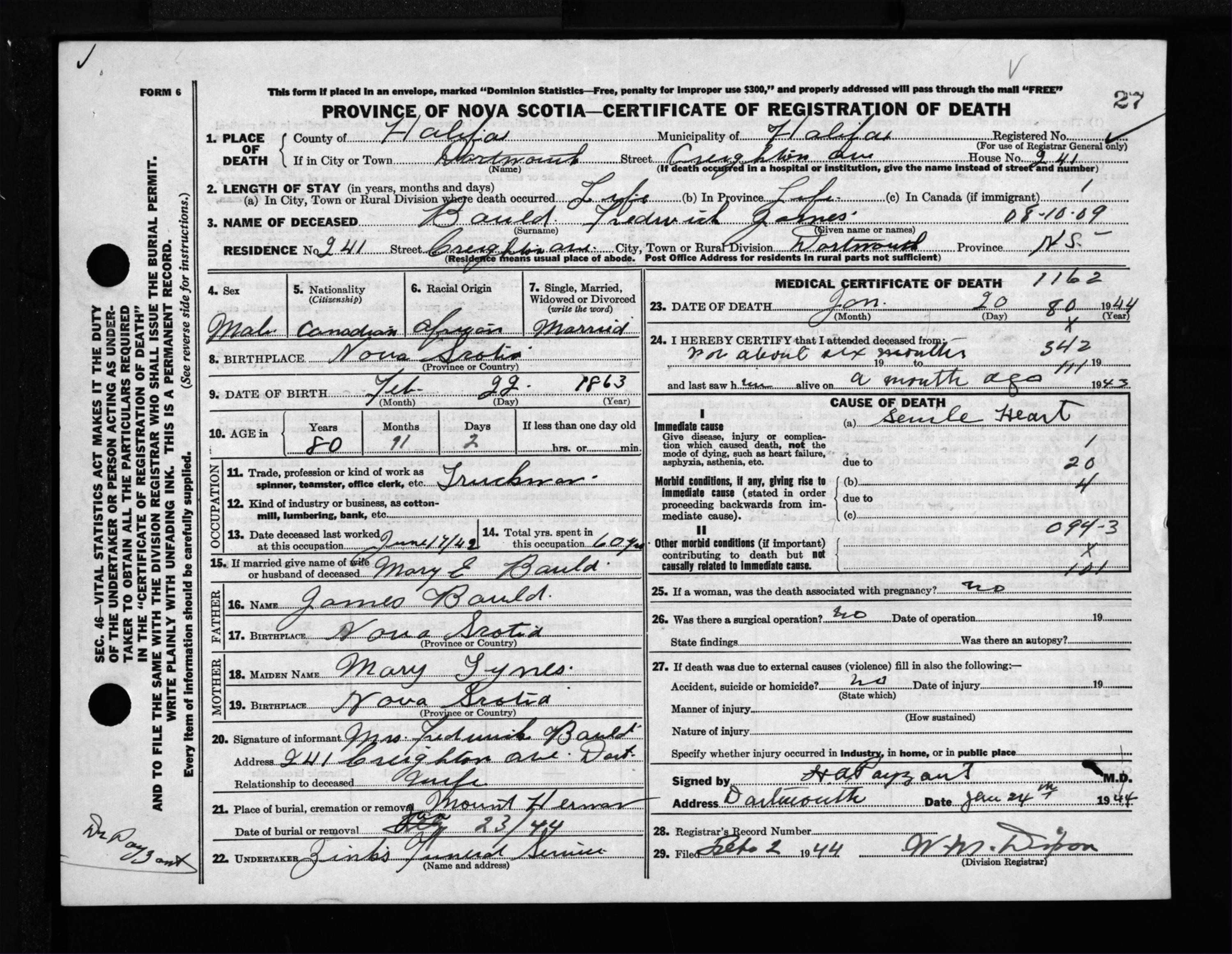 Male Death Registration: Year: 1944 file: 218 number: 27