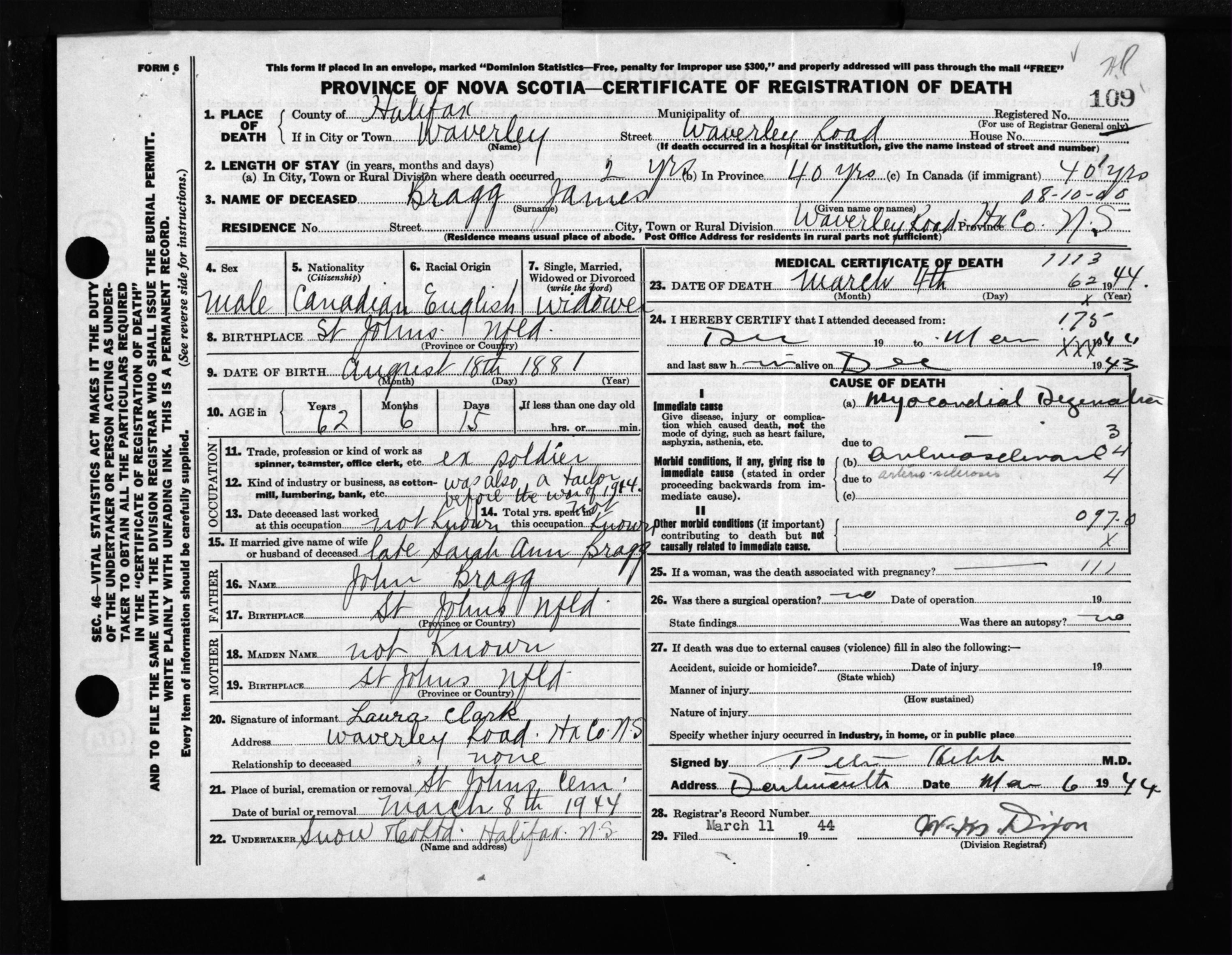 Male Death Registration: Year: 1944 file: 218 number: 109