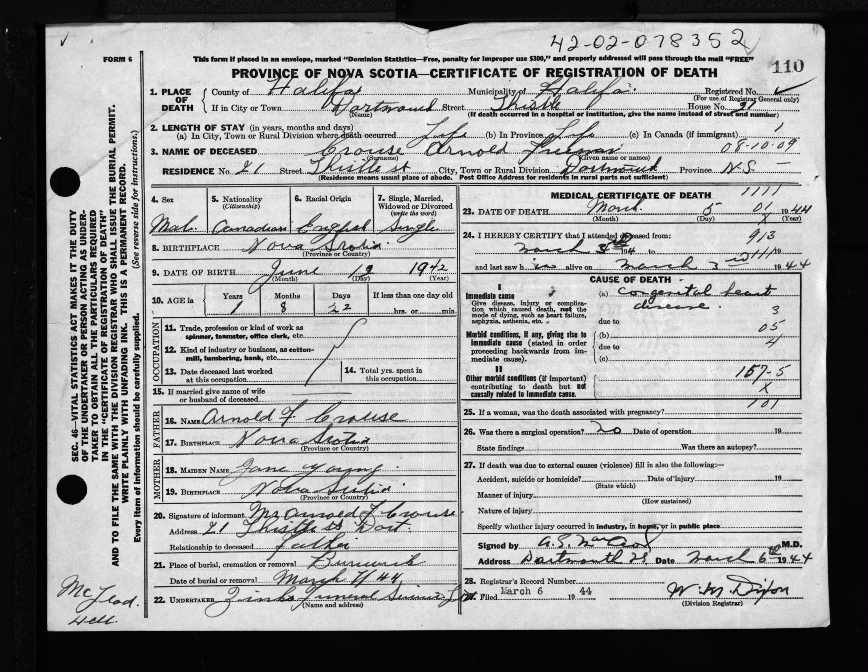 Male Death Registration: Year: 1944 file: 218 number: 110