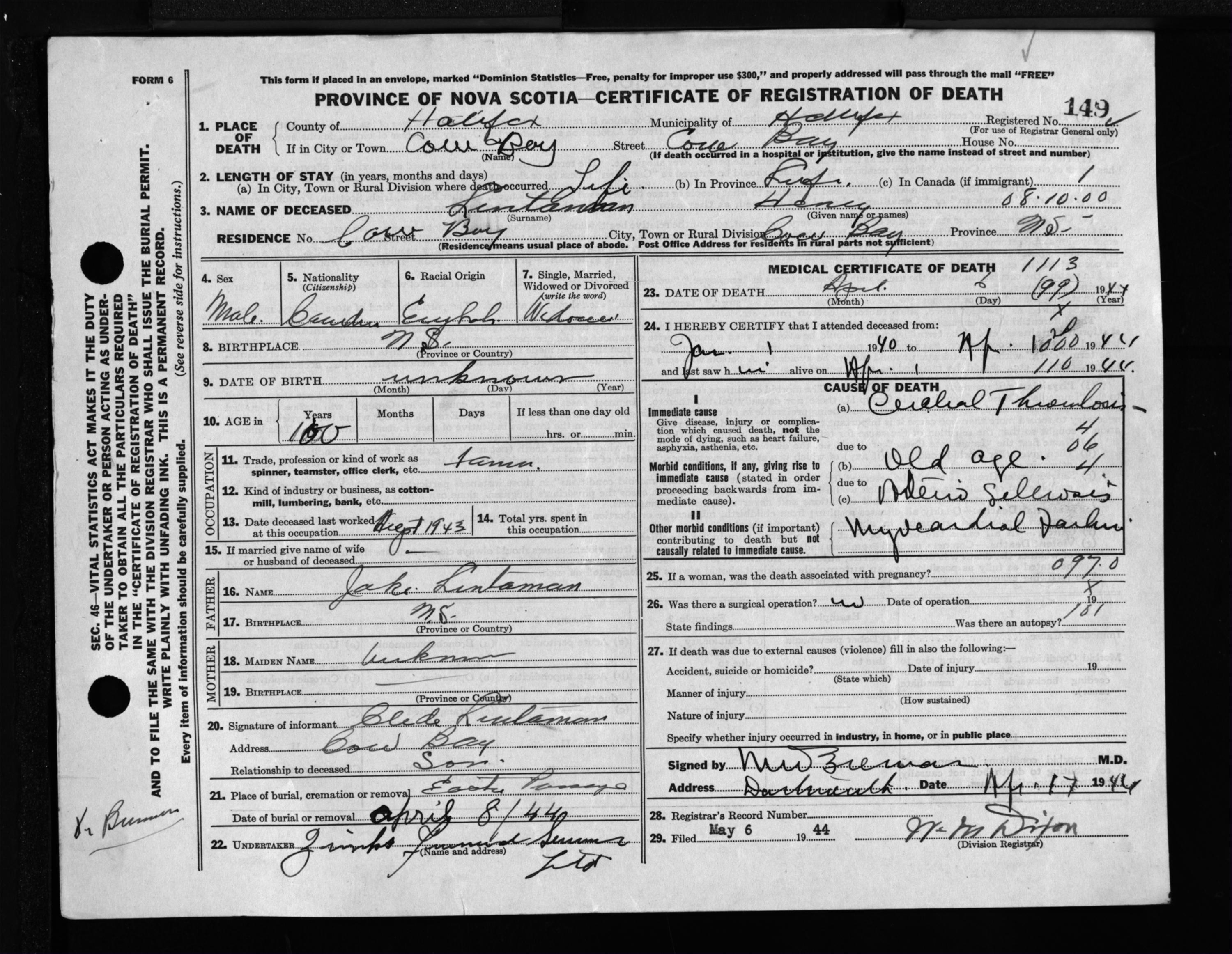 Male Death Registration: Year: 1944 file: 218 number: 149