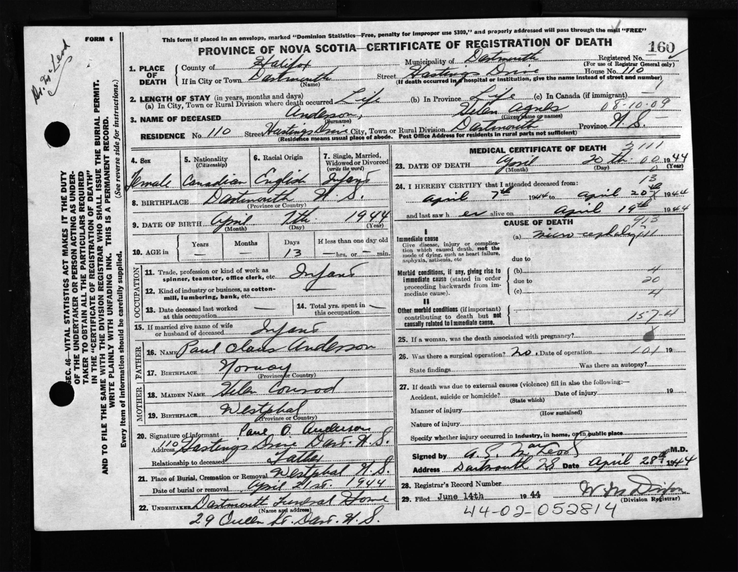 Female Death Registration: Year: 1944 file: 218 number: 160