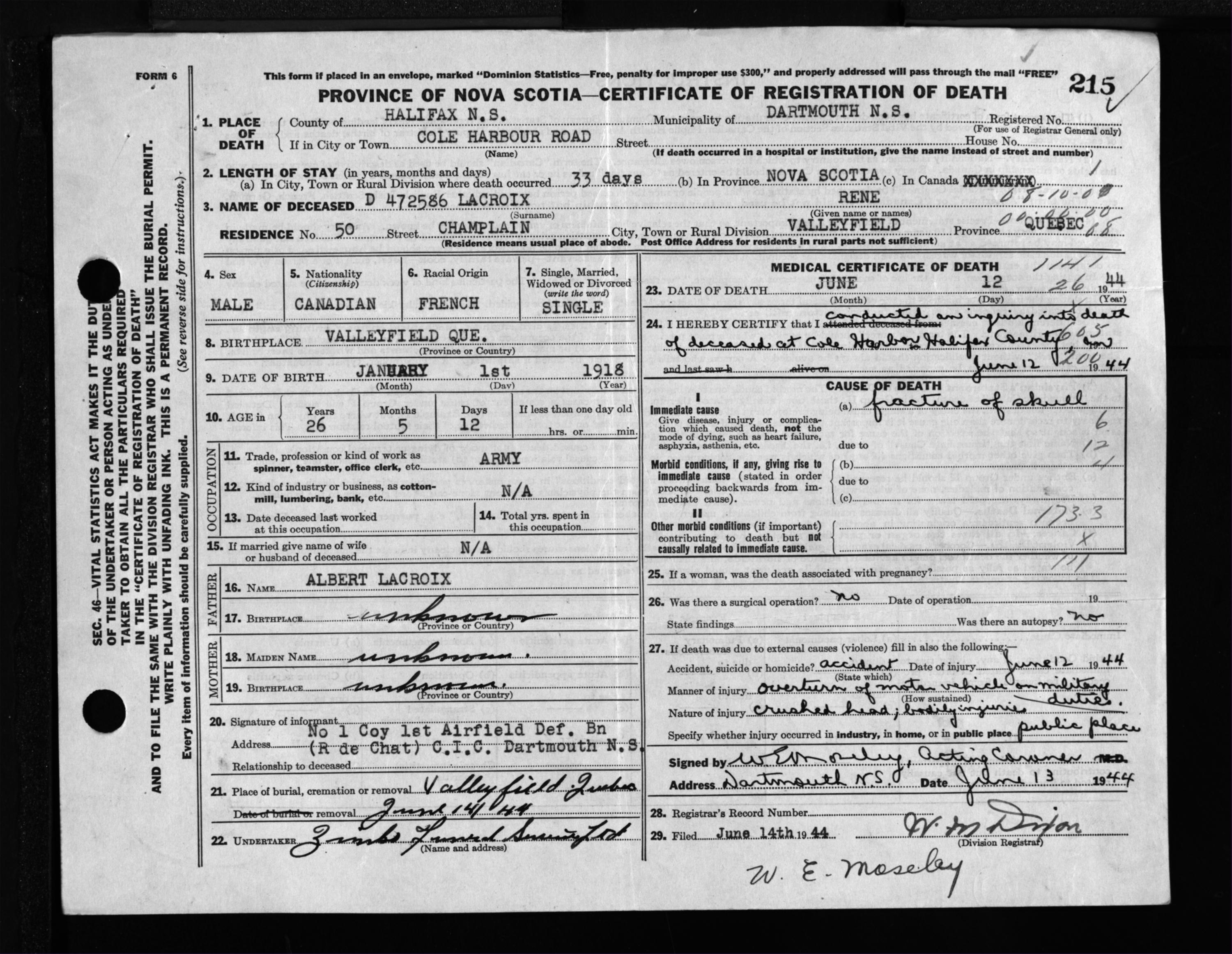Male Death Registration: Year: 1944 file: 218 number: 215