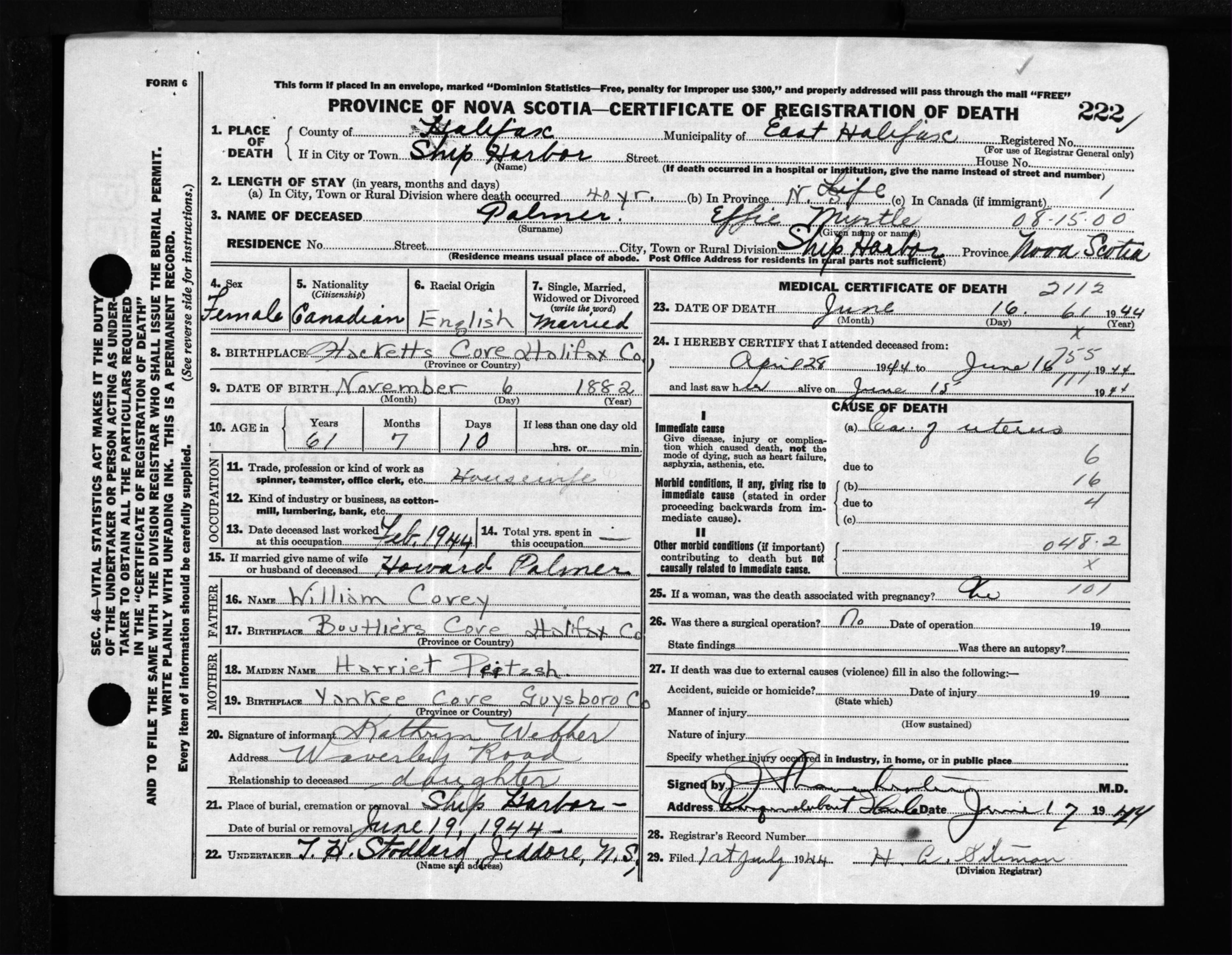 Female Death Registration: Year: 1944 file: 218 number: 222