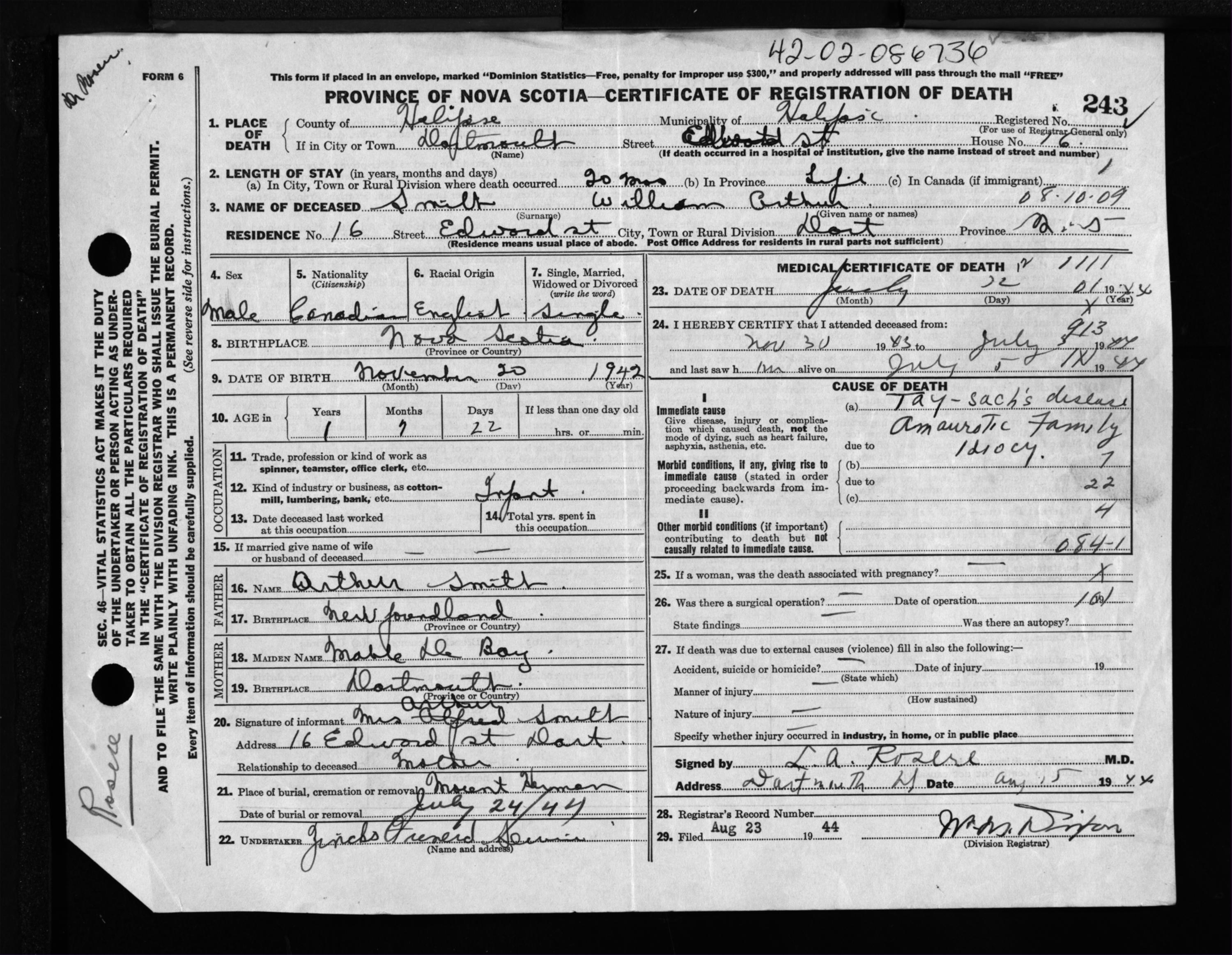 Male Death Registration: Year: 1944 file: 218 number: 243