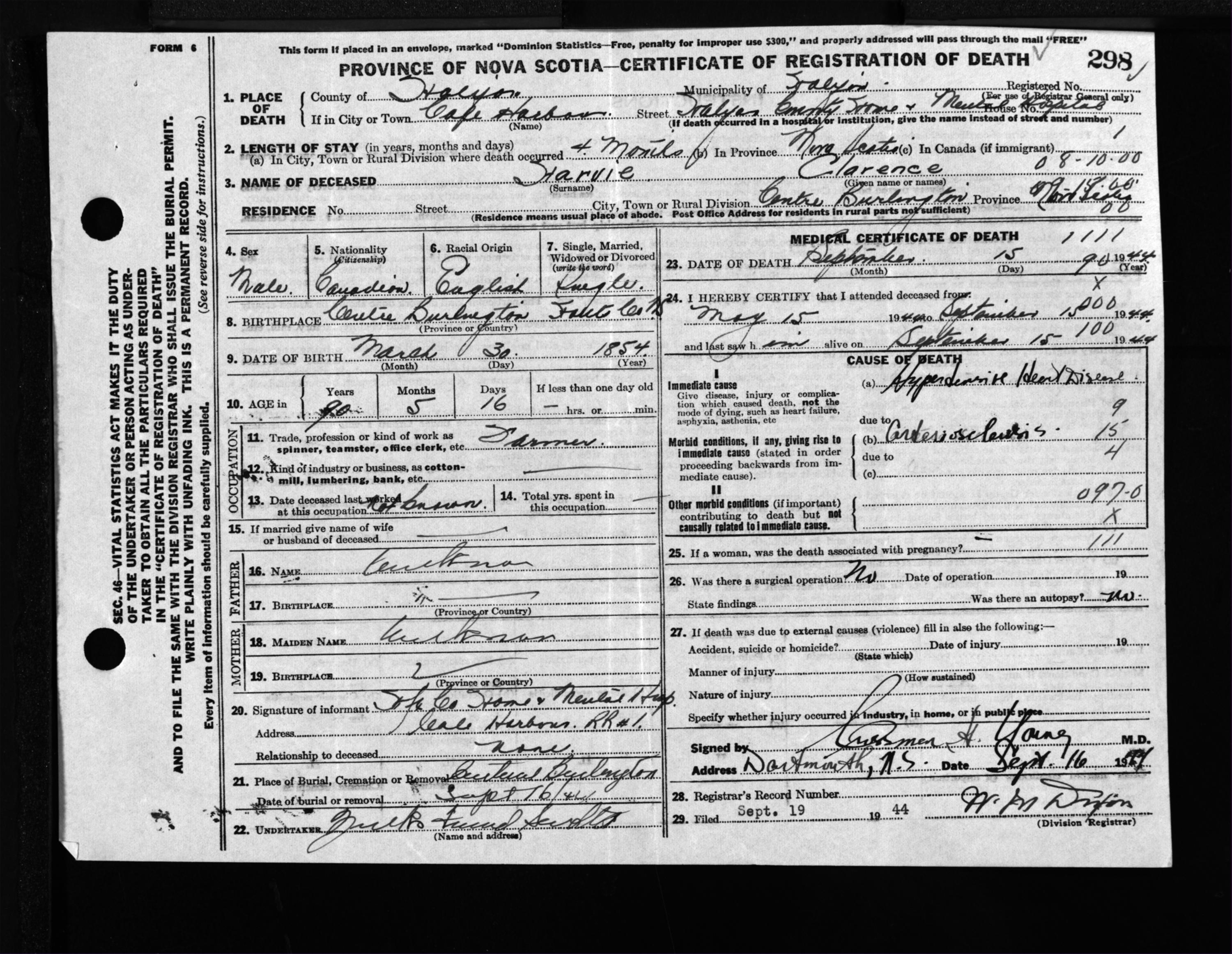 Male Death Registration: Year: 1944 file: 218 number: 298