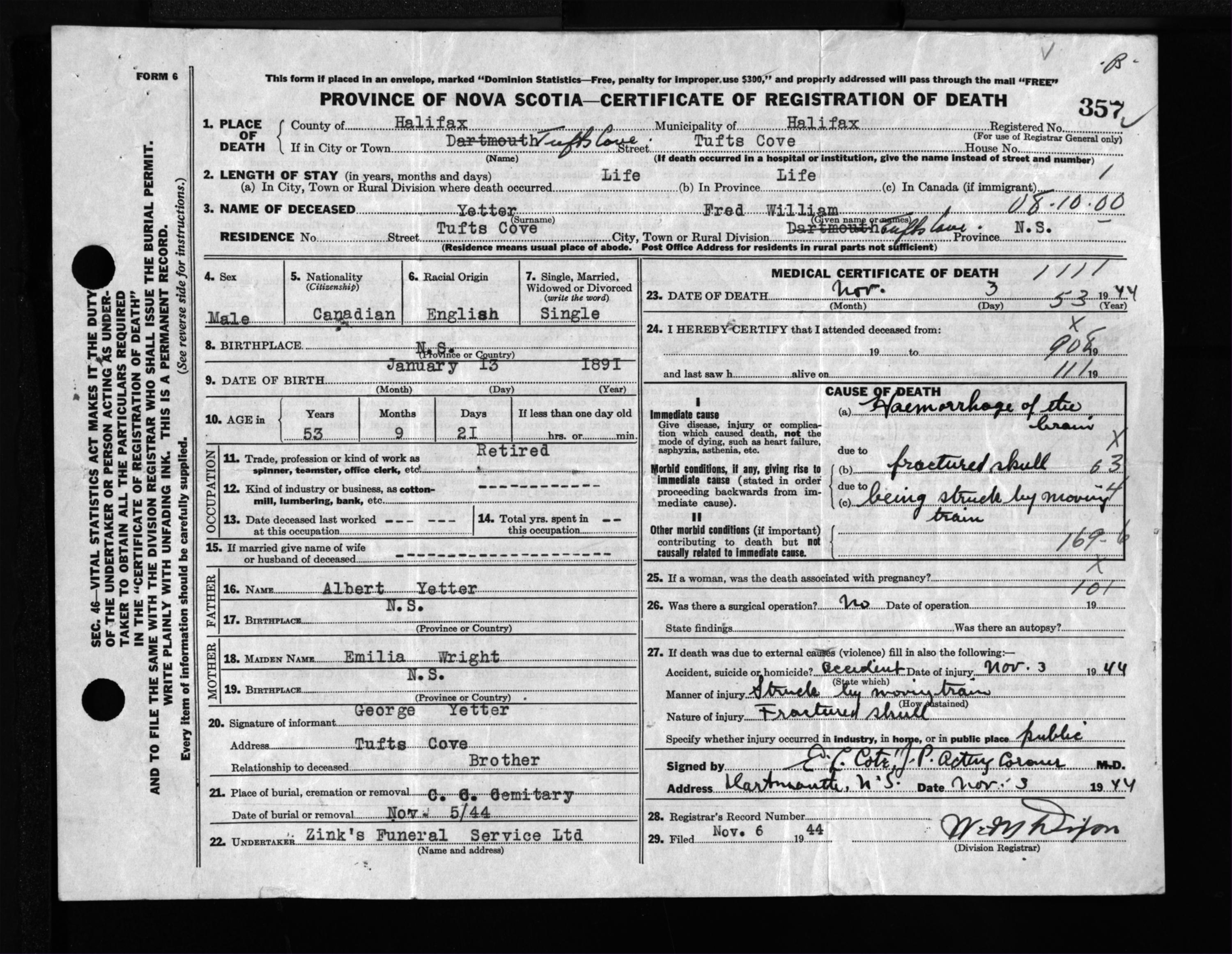 Male Death Registration: Year: 1944 file: 218 number: 357