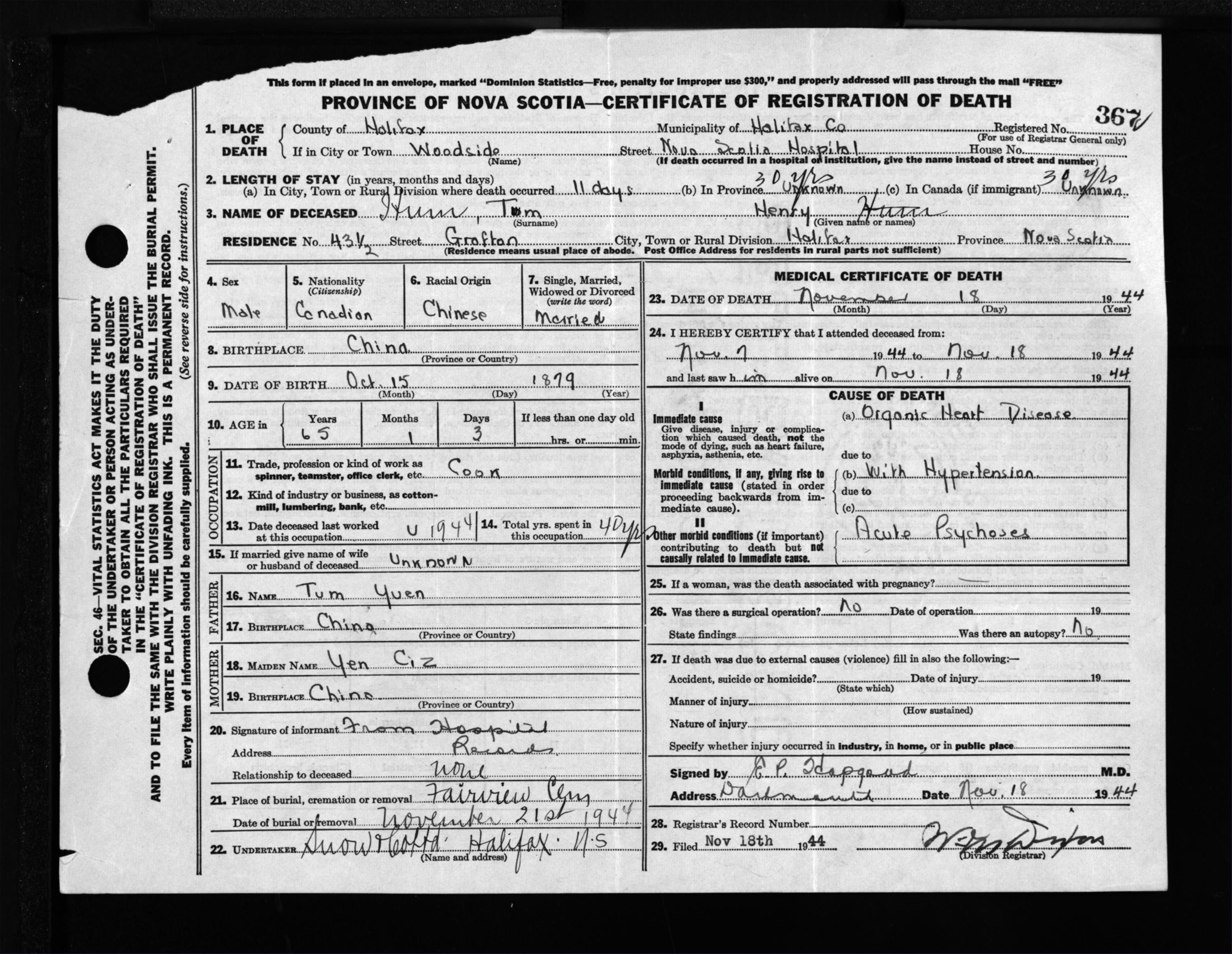 Male Death Registration: Year: 1944 file: 218 number: 367