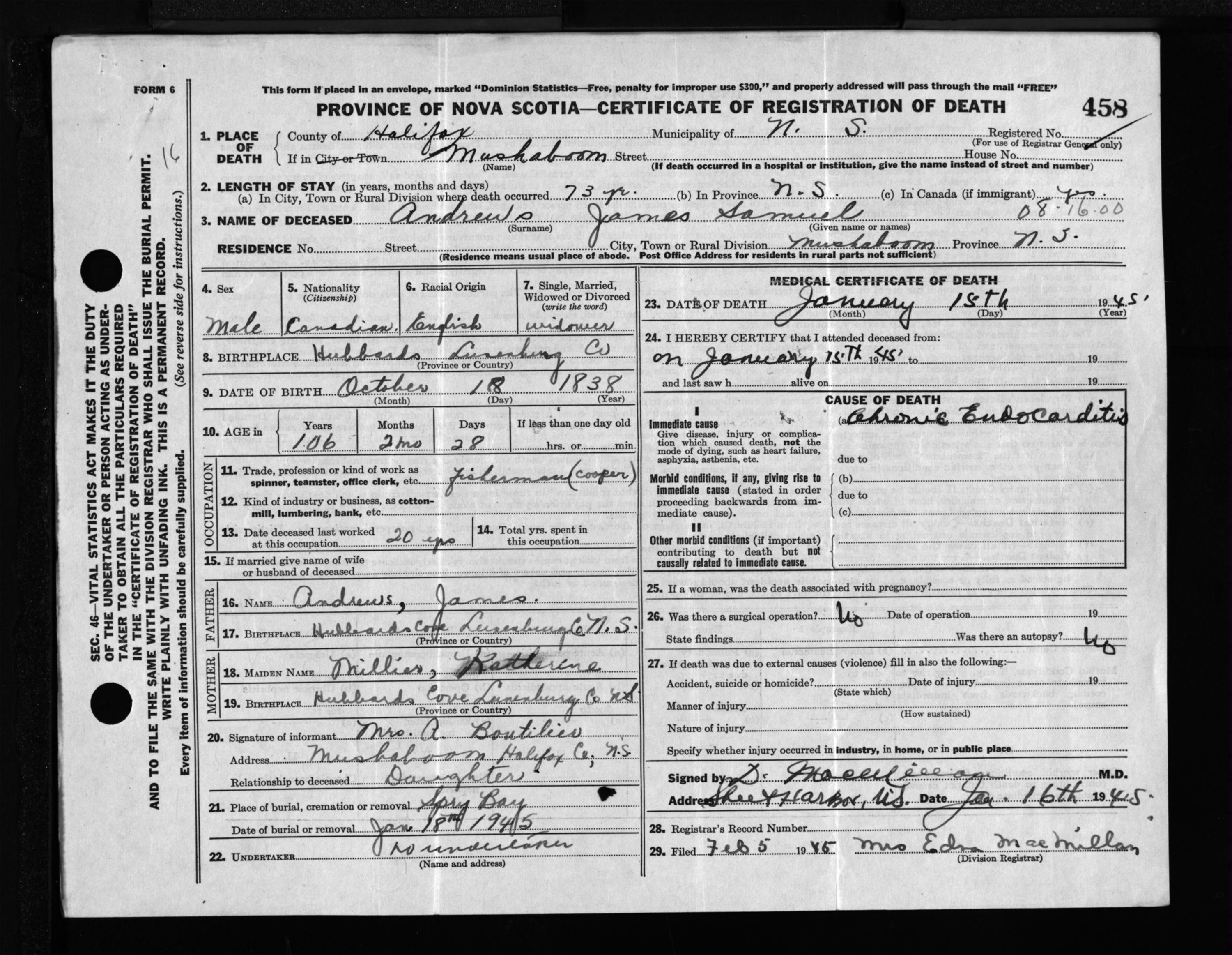Male Death Registration: Year: 1945 file: 218 number: 458