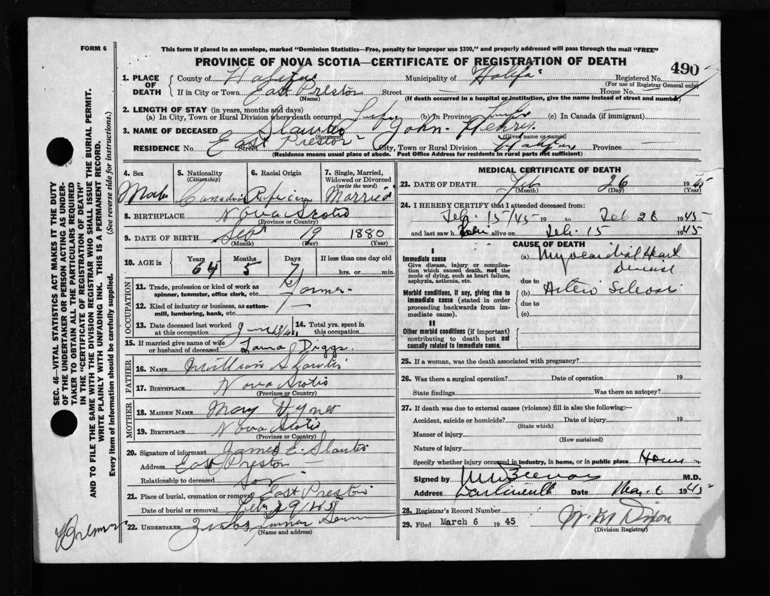 Male Death Registration: Year: 1945 file: 218 number: 490