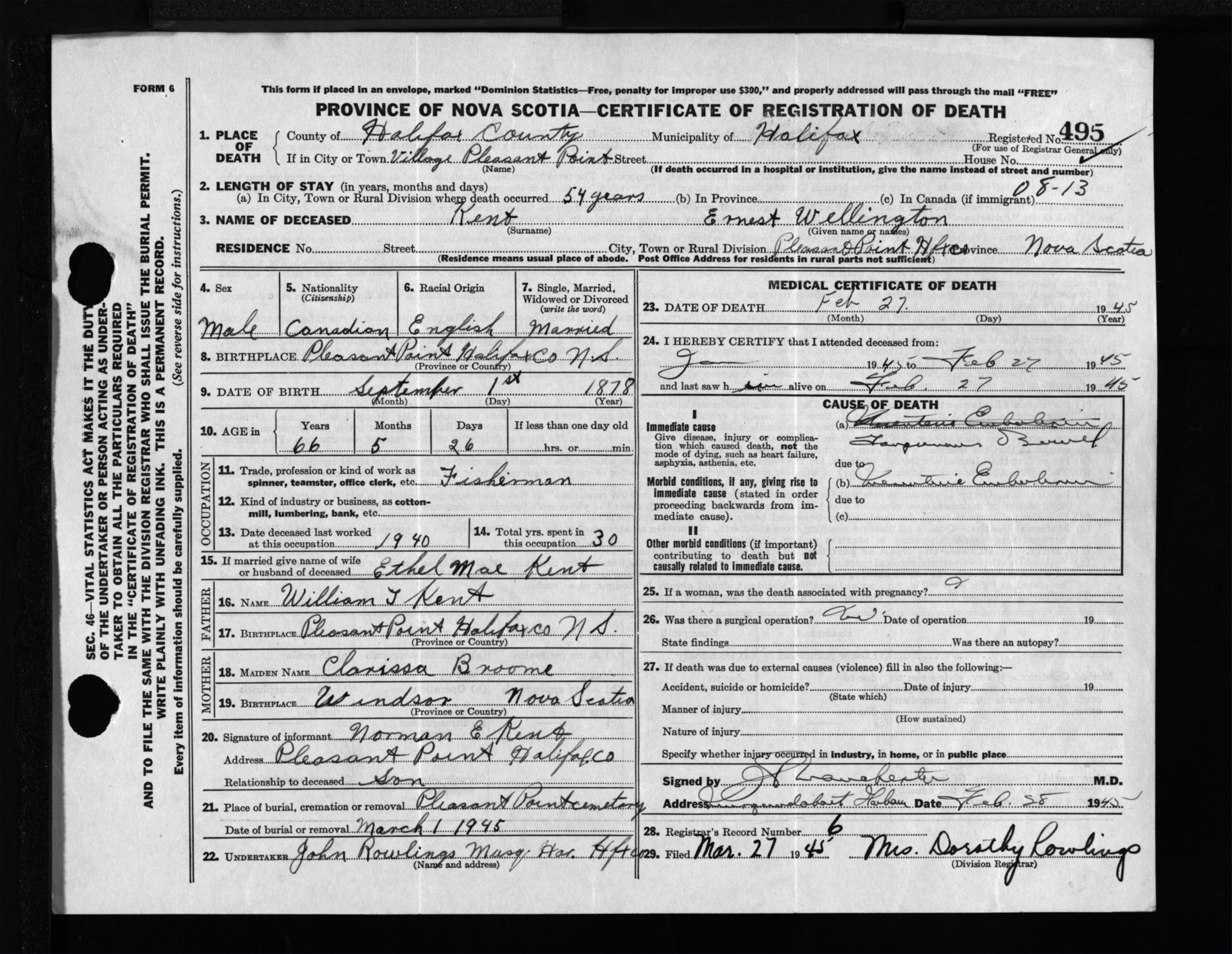 Male Death Registration: Year: 1945 file: 218 number: 495
