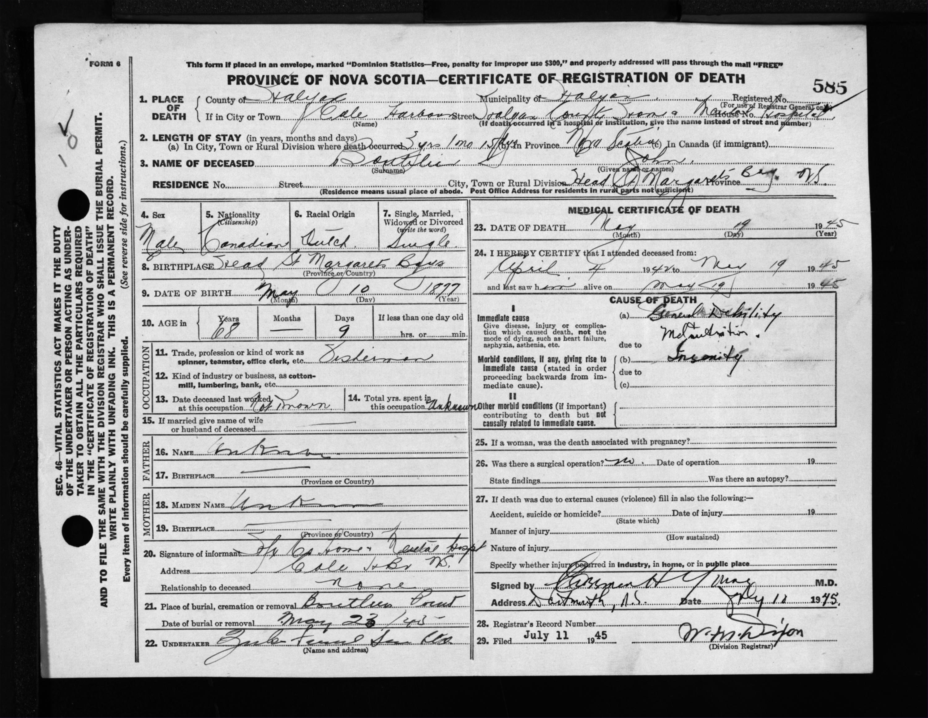 Male Death Registration: Year: 1945 file: 218 number: 585