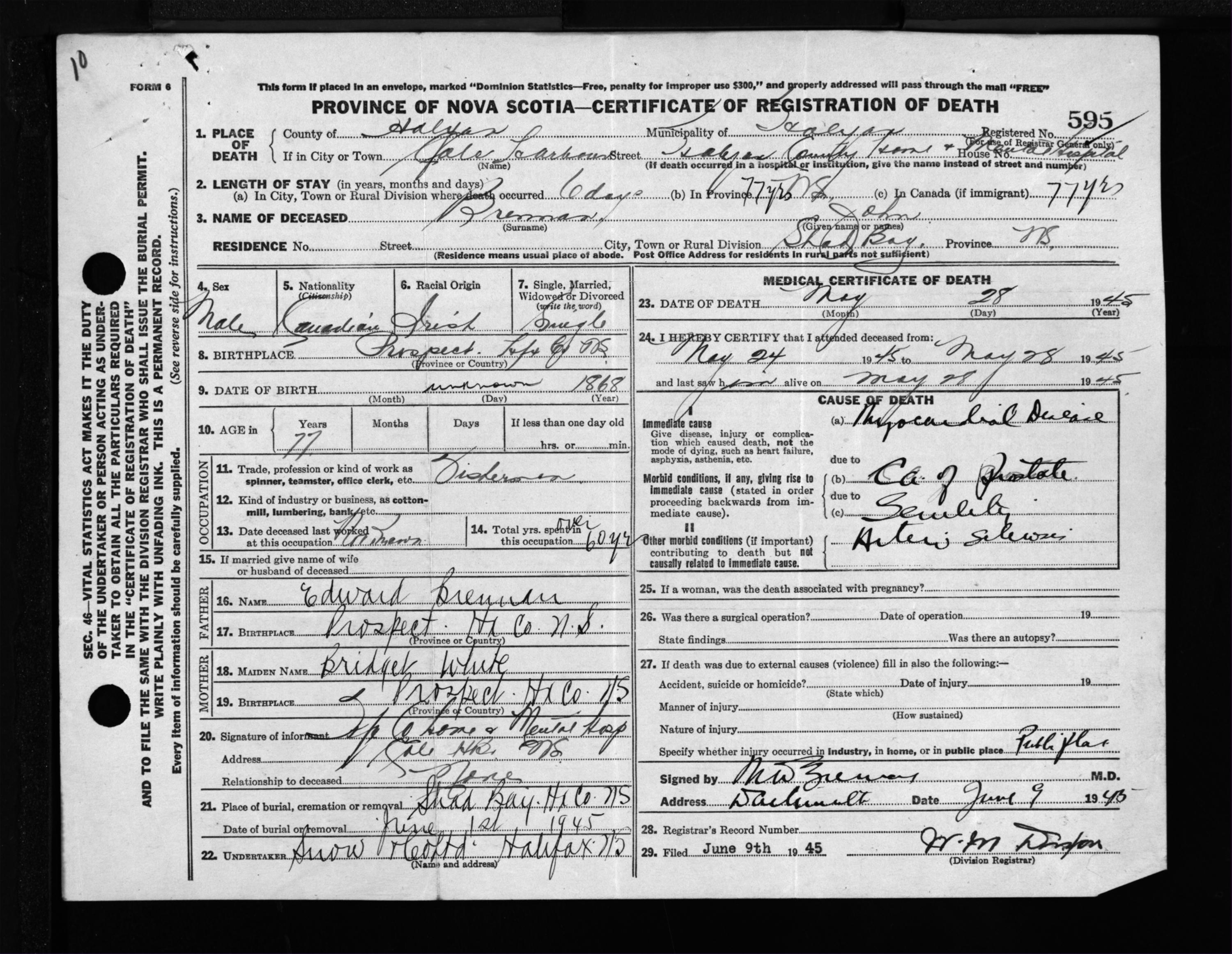 Male Death Registration: Year: 1945 file: 218 number: 595