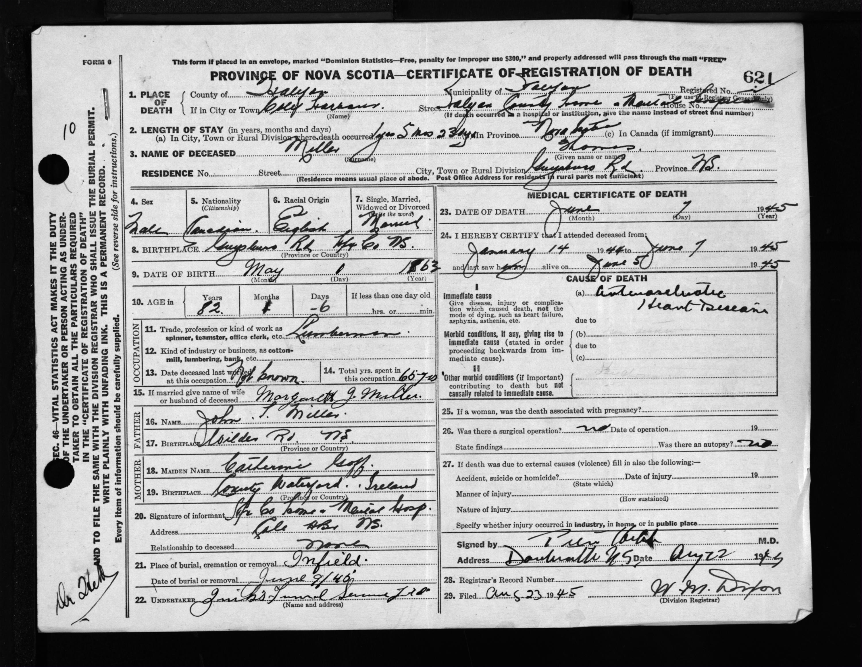 Male Death Registration: Year: 1945 file: 218 number: 621