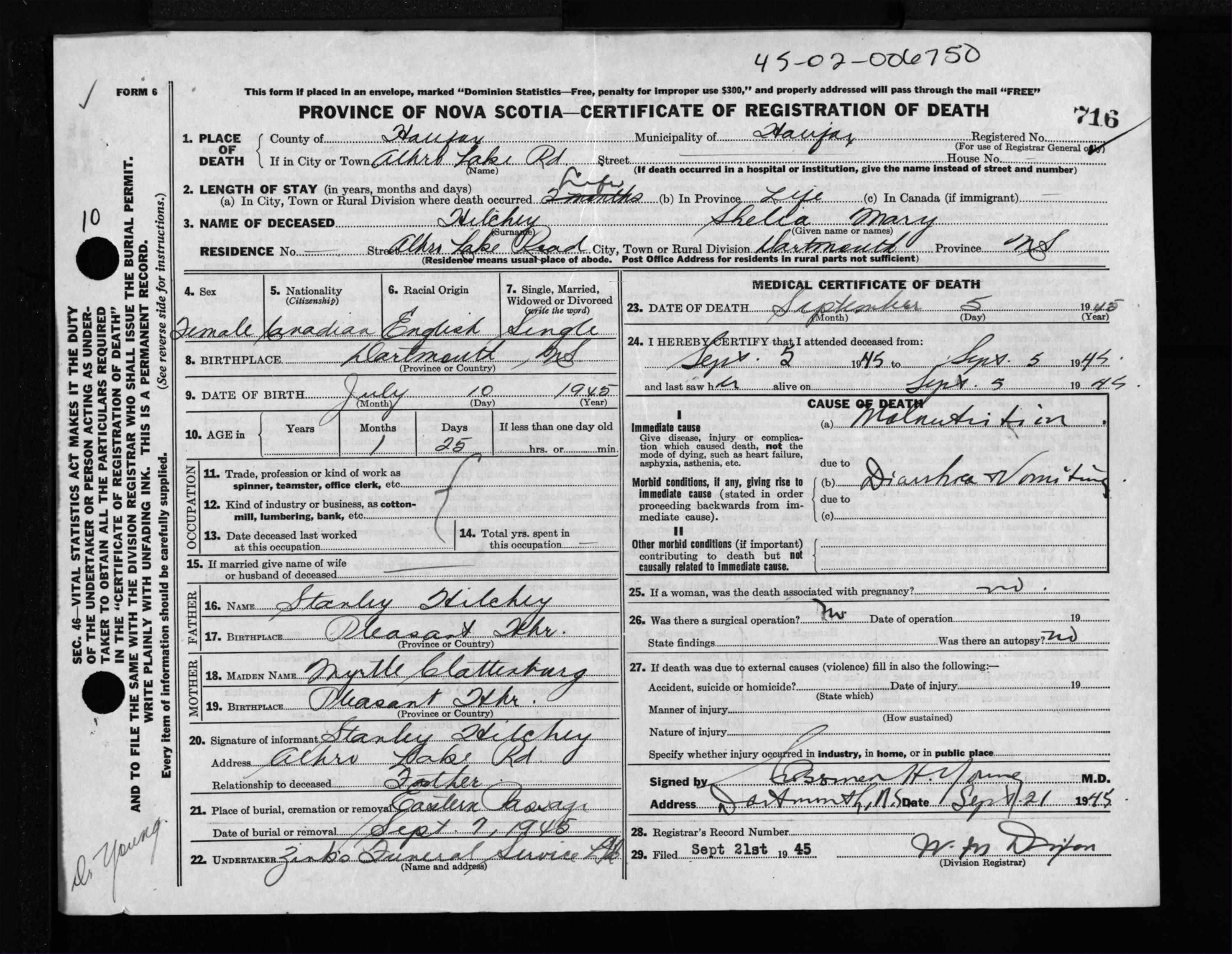 Female Death Registration: Year: 1945 file: 218 number: 716