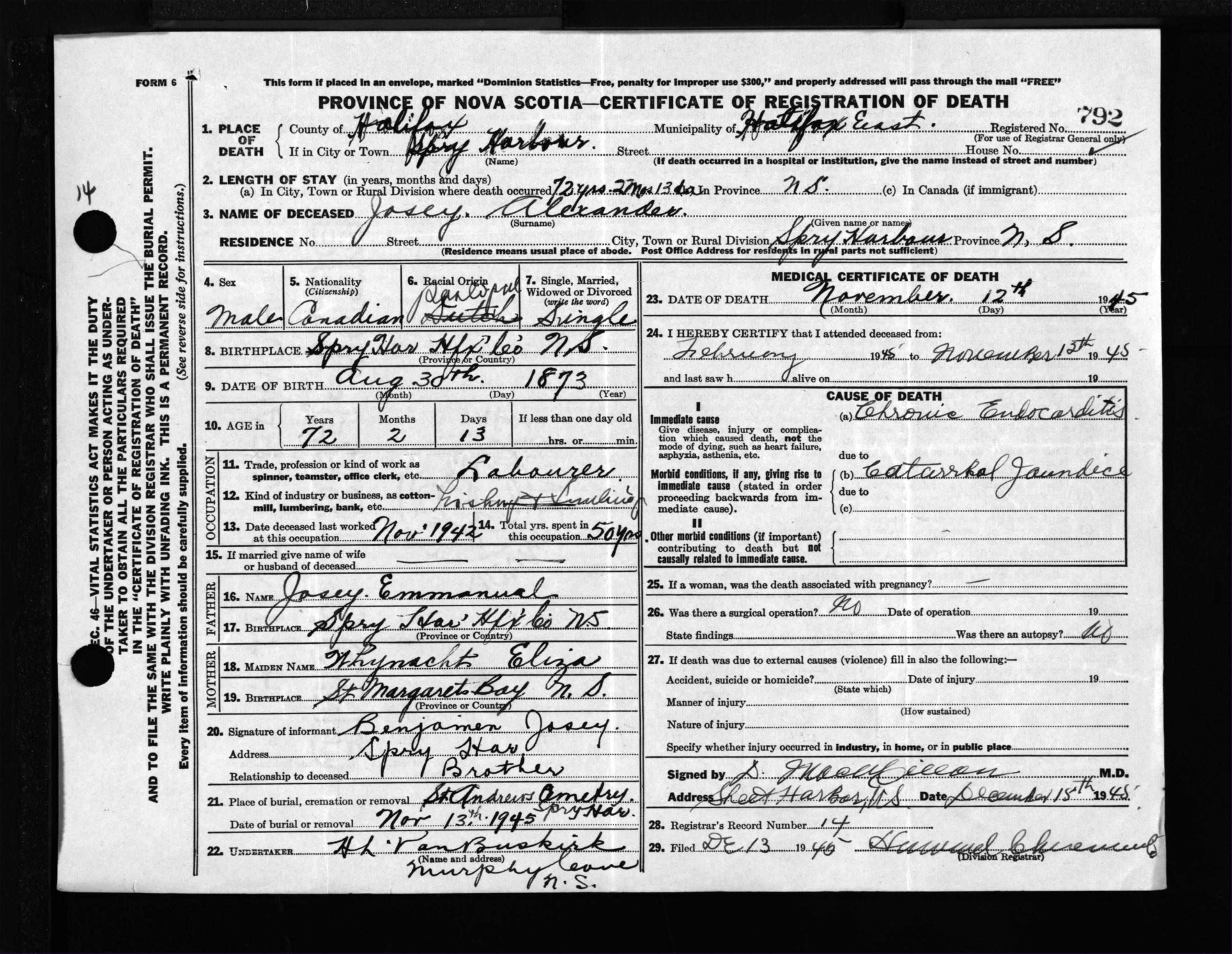 Male Death Registration: Year: 1945 file: 218 number: 792