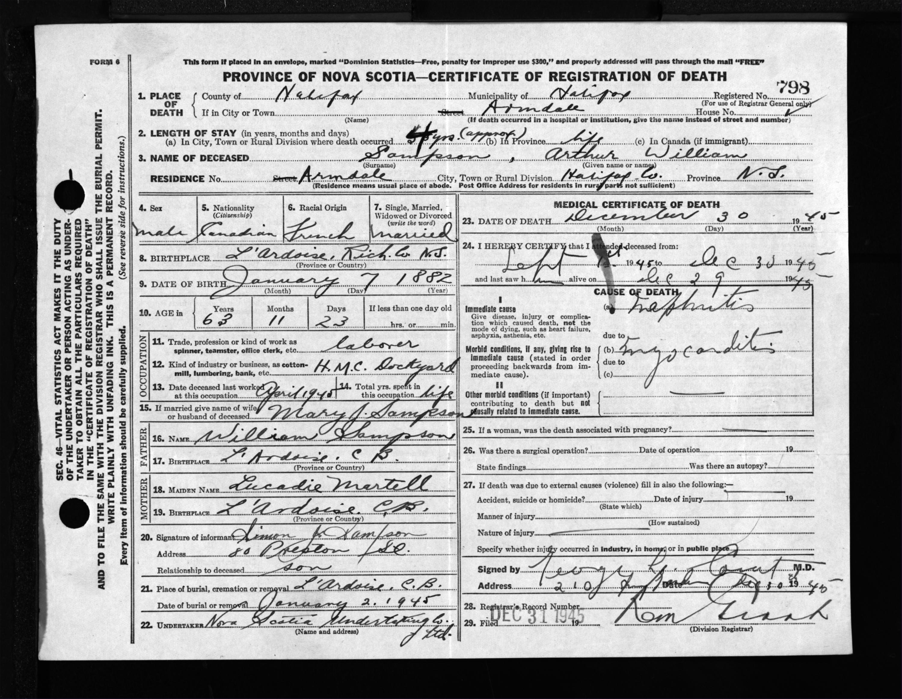 Male Death Registration: Year: 1945 file: 218 number: 798