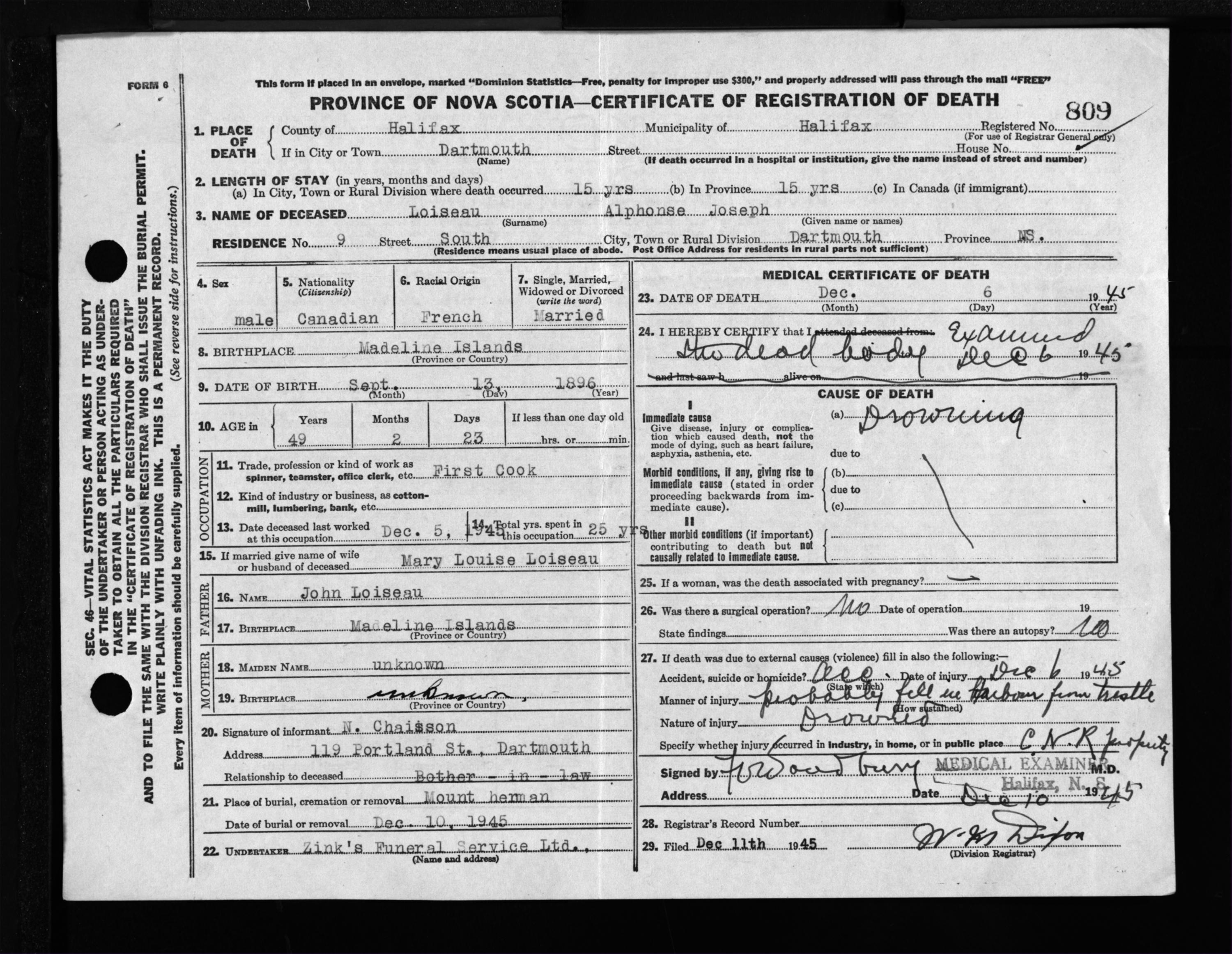 Male Death Registration: Year: 1945 file: 218 number: 809