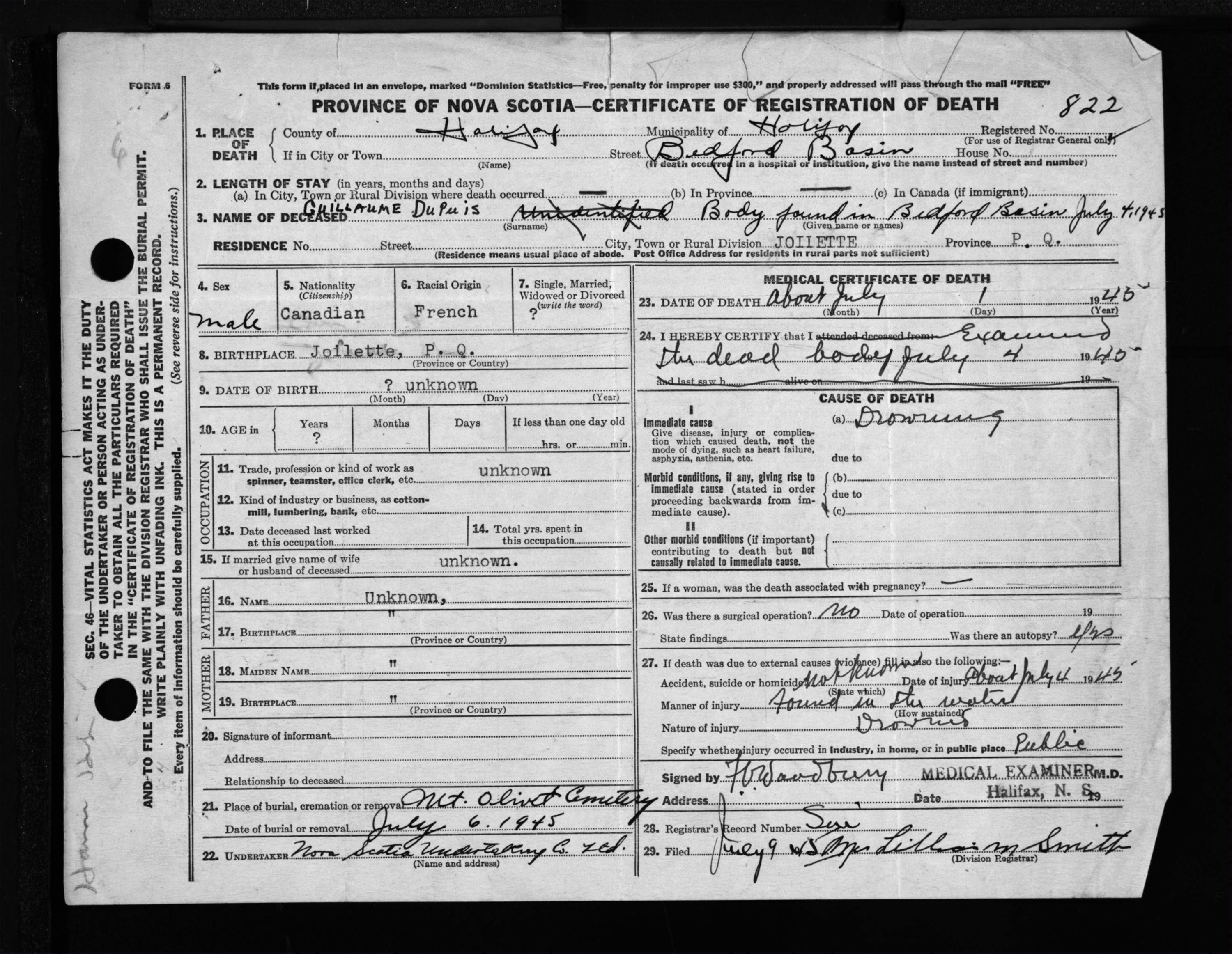 Male Death Registration: Year: 1945 file: 218 number: 822