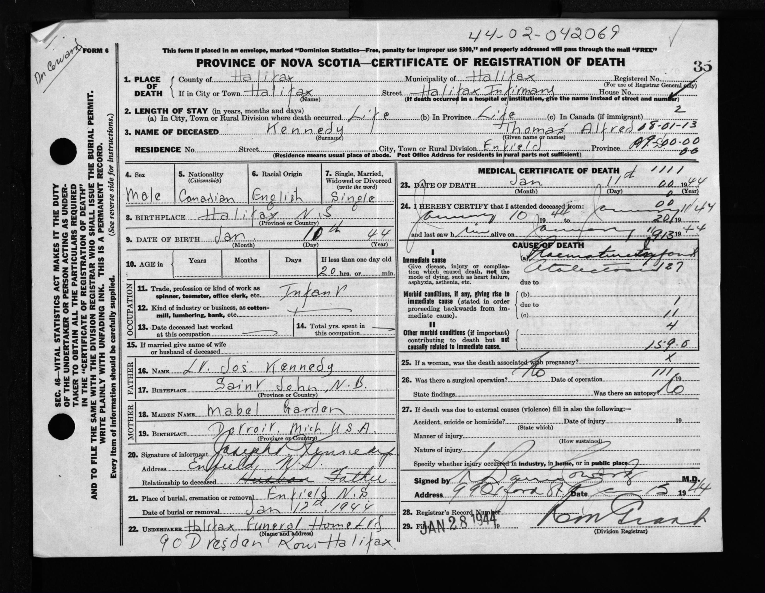 Male Death Registration: Year: 1944 file: 219 number: 35