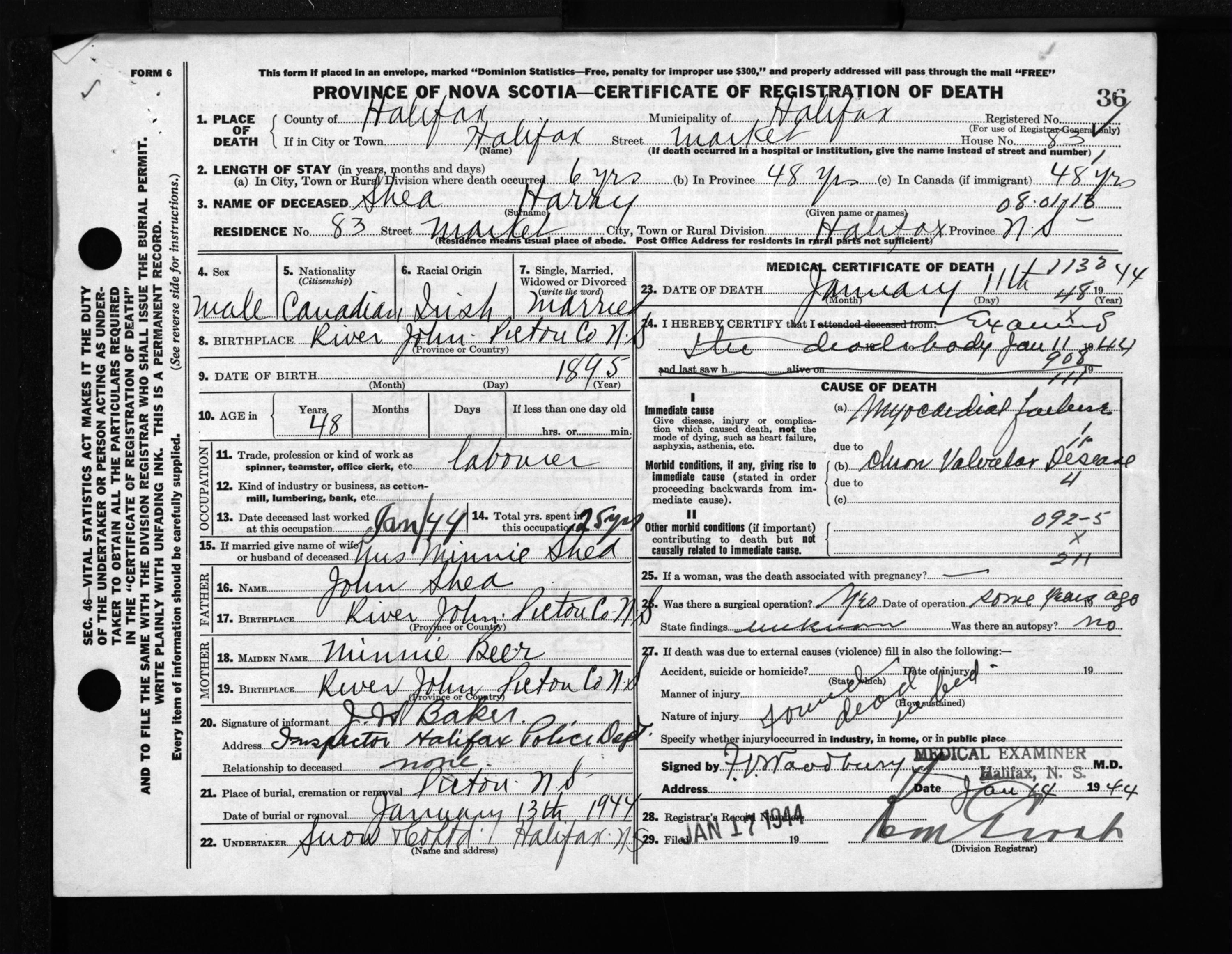 Male Death Registration: Year: 1944 file: 219 number: 36