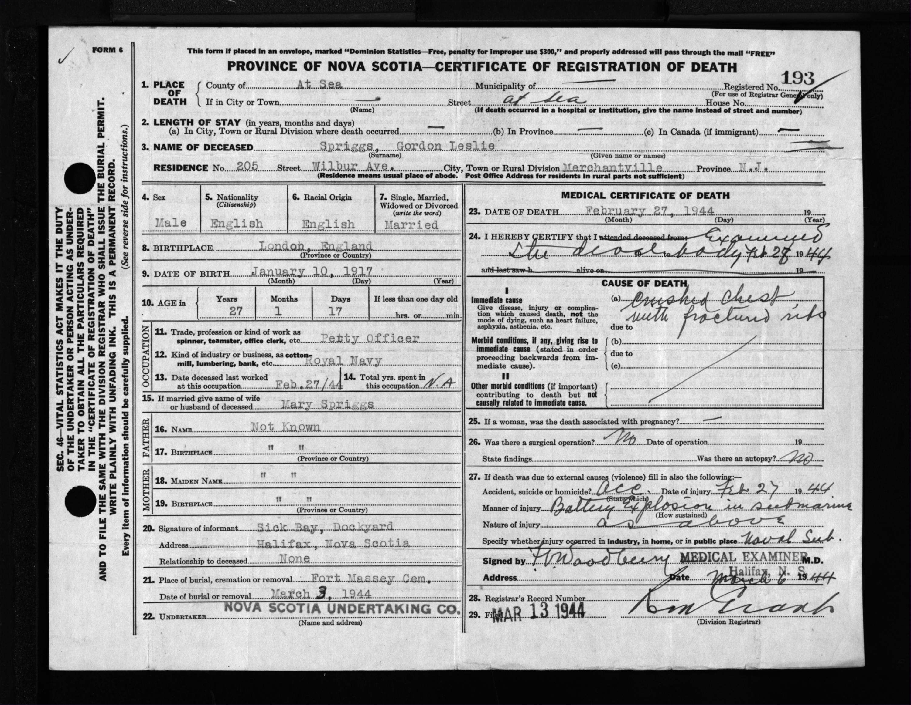 Male Death Registration: Year: 1944 file: 219 number: 193