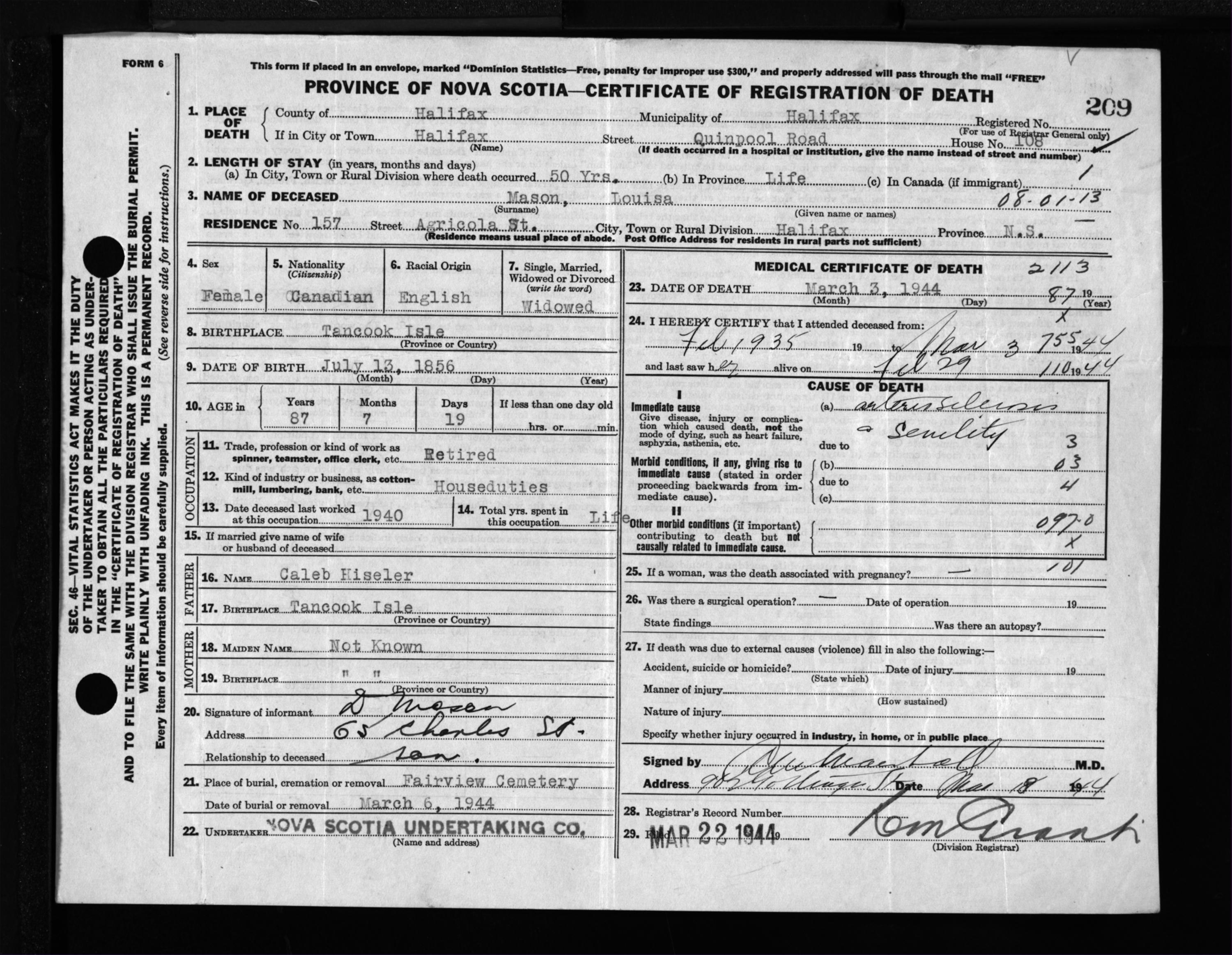 Female Death Registration: Year: 1944 file: 219 number: 209