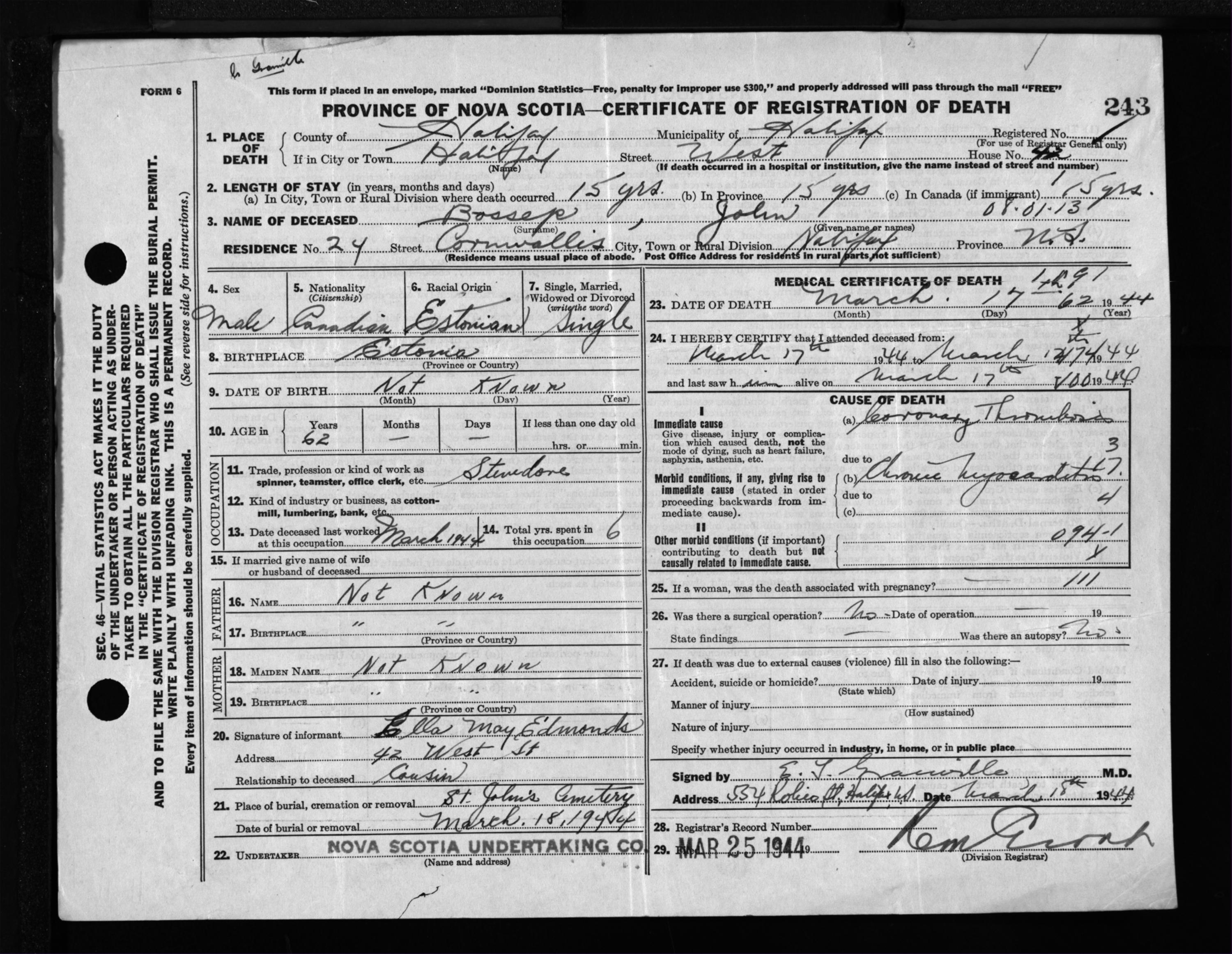 Male Death Registration: Year: 1944 file: 219 number: 243