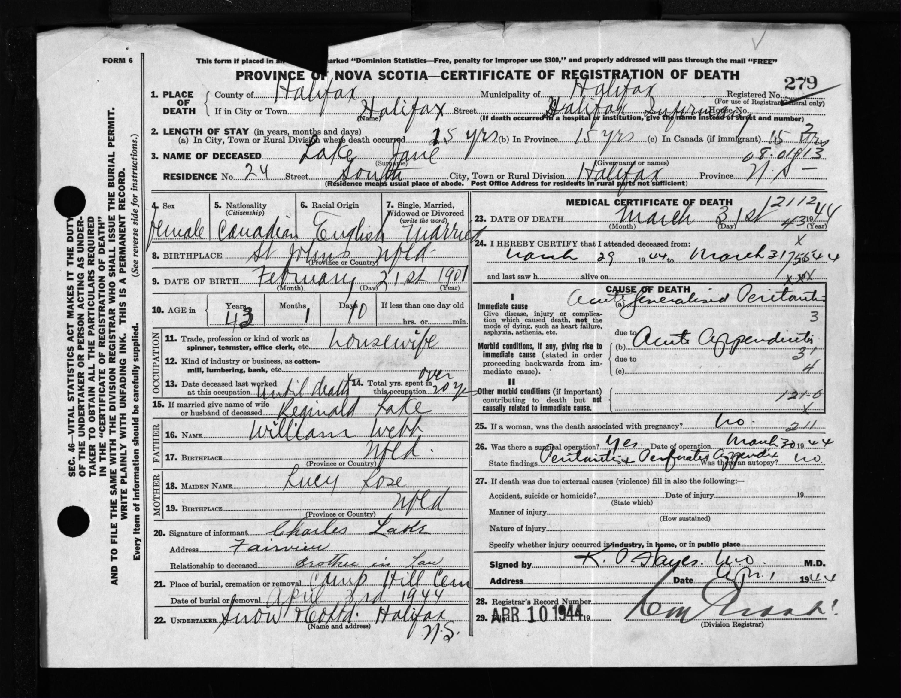 Female Death Registration: Year: 1944 file: 219 number: 279