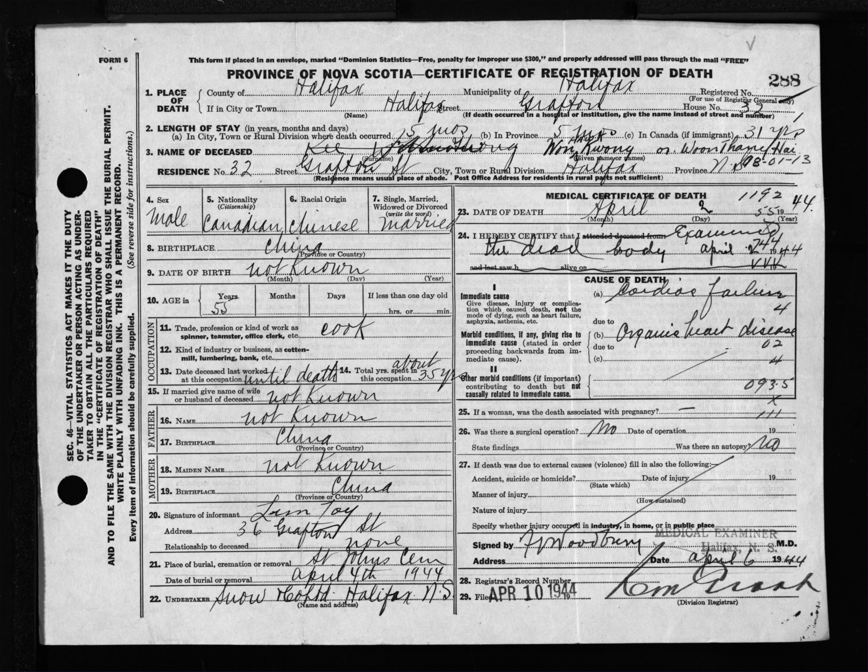 Male Death Registration: Year: 1944 file: 219 number: 288