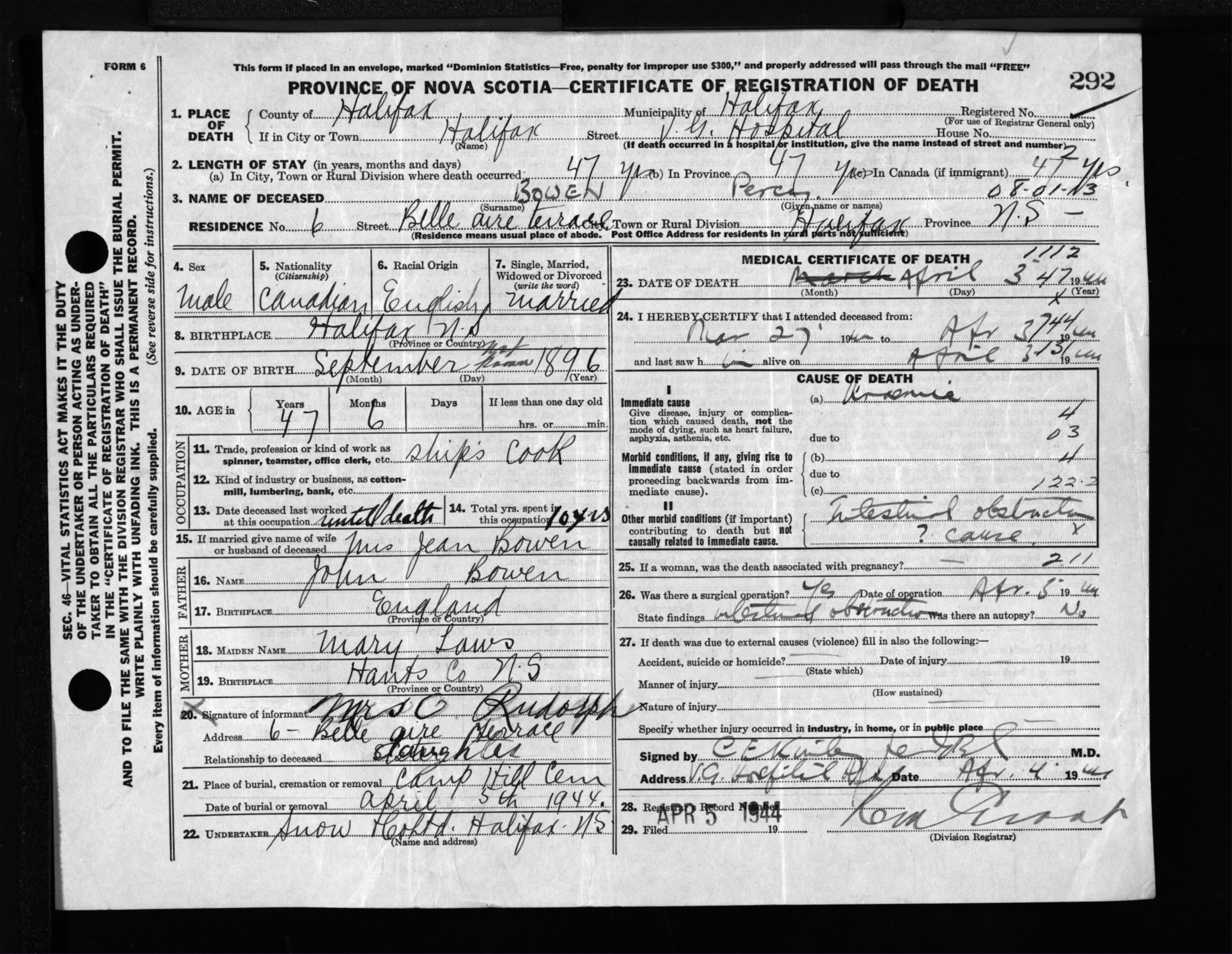 Male Death Registration: Year: 1944 file: 219 number: 292