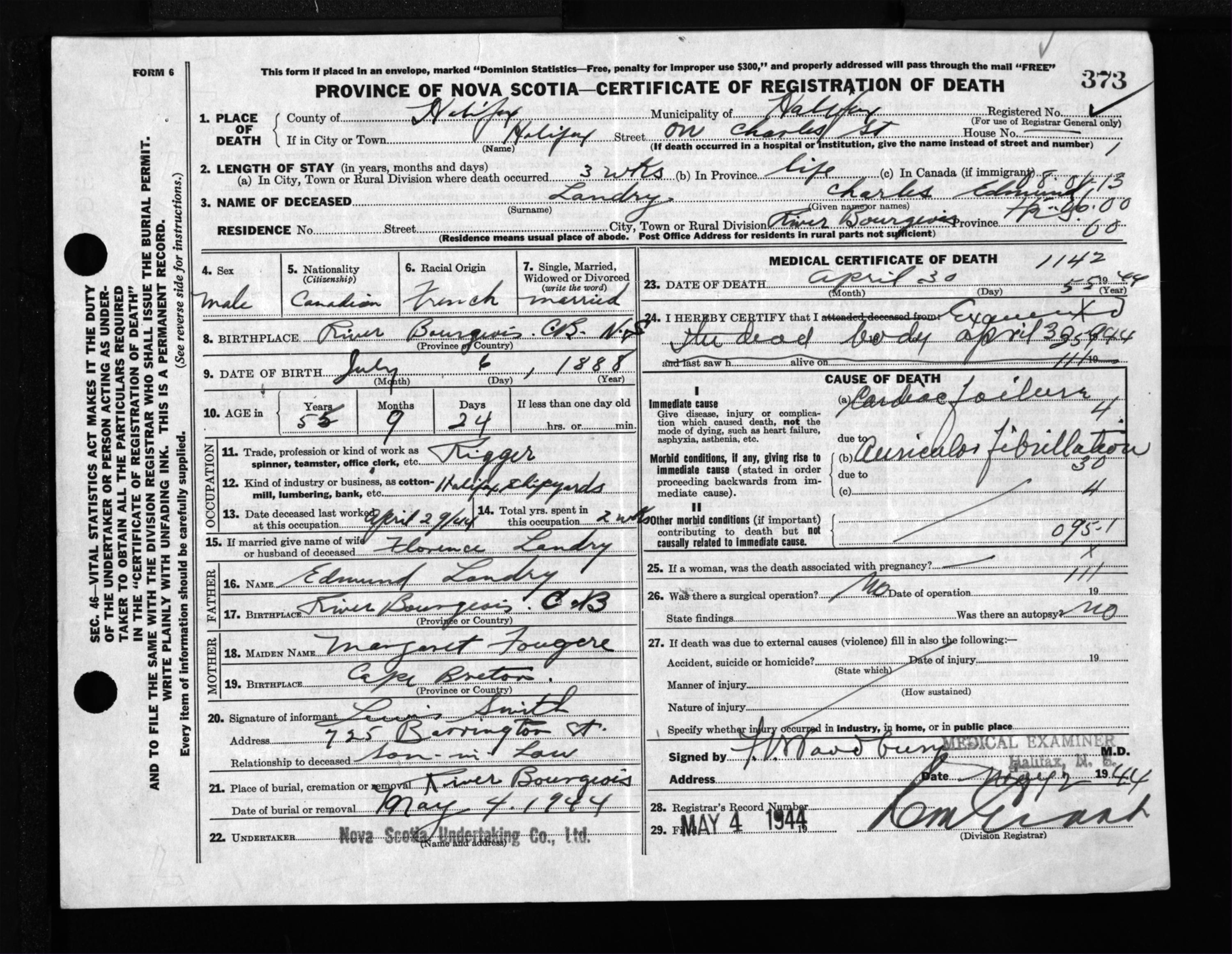 Male Death Registration: Year: 1944 file: 219 number: 373