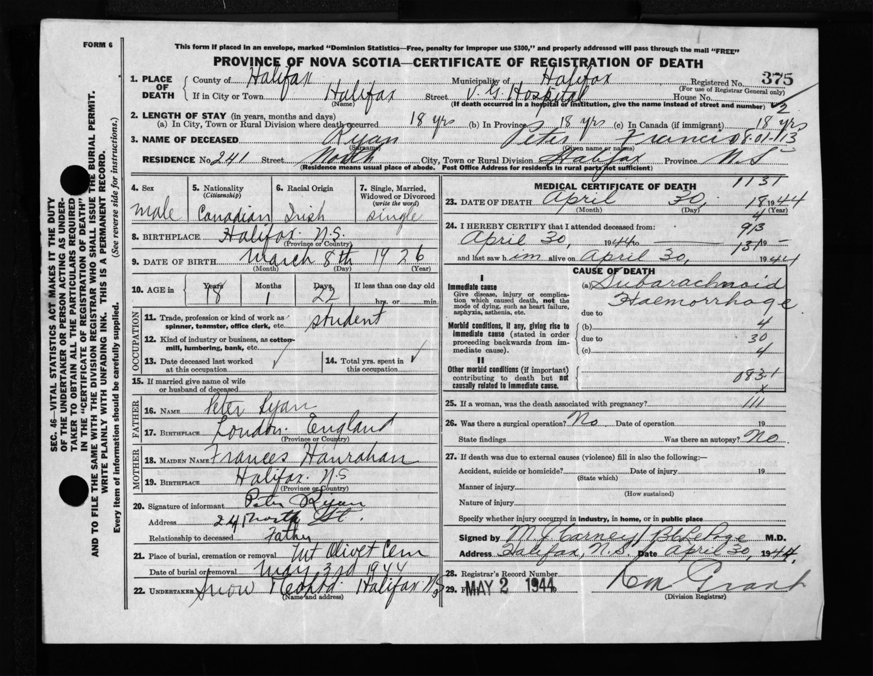 Male Death Registration: Year: 1944 file: 219 number: 375