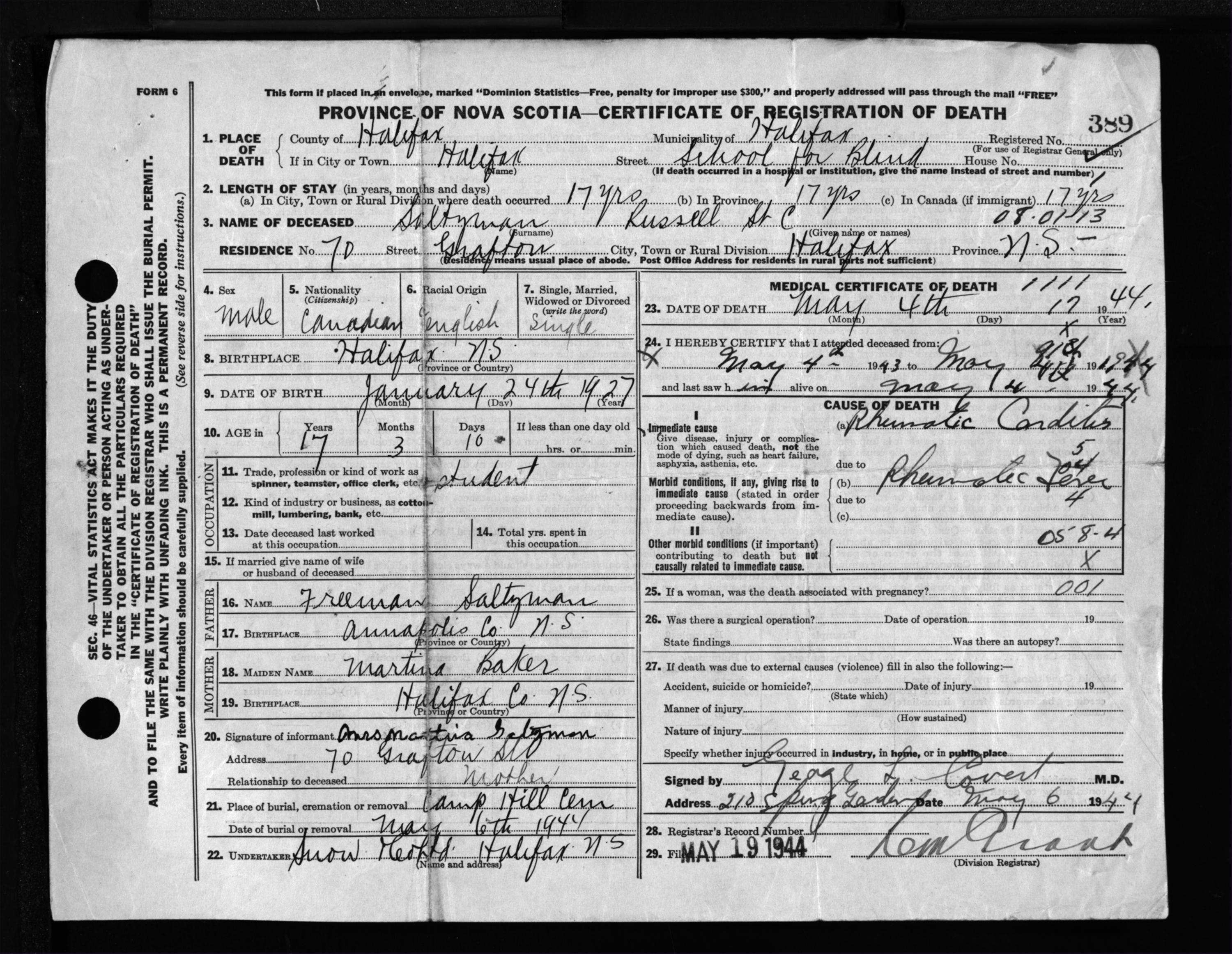 Male Death Registration: Year: 1944 file: 219 number: 389