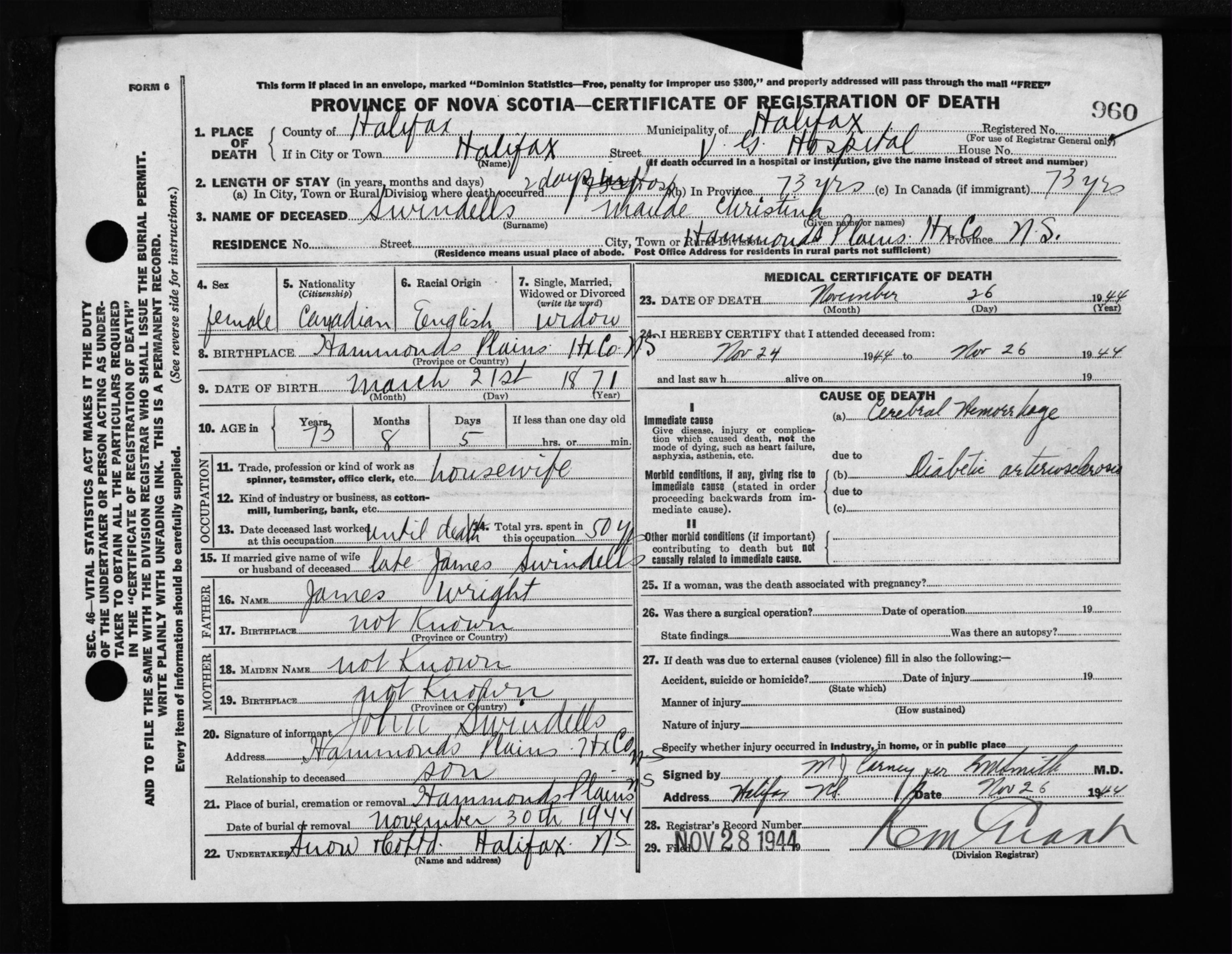 Female Death Registration: Year: 1944 file: 219 number: 960