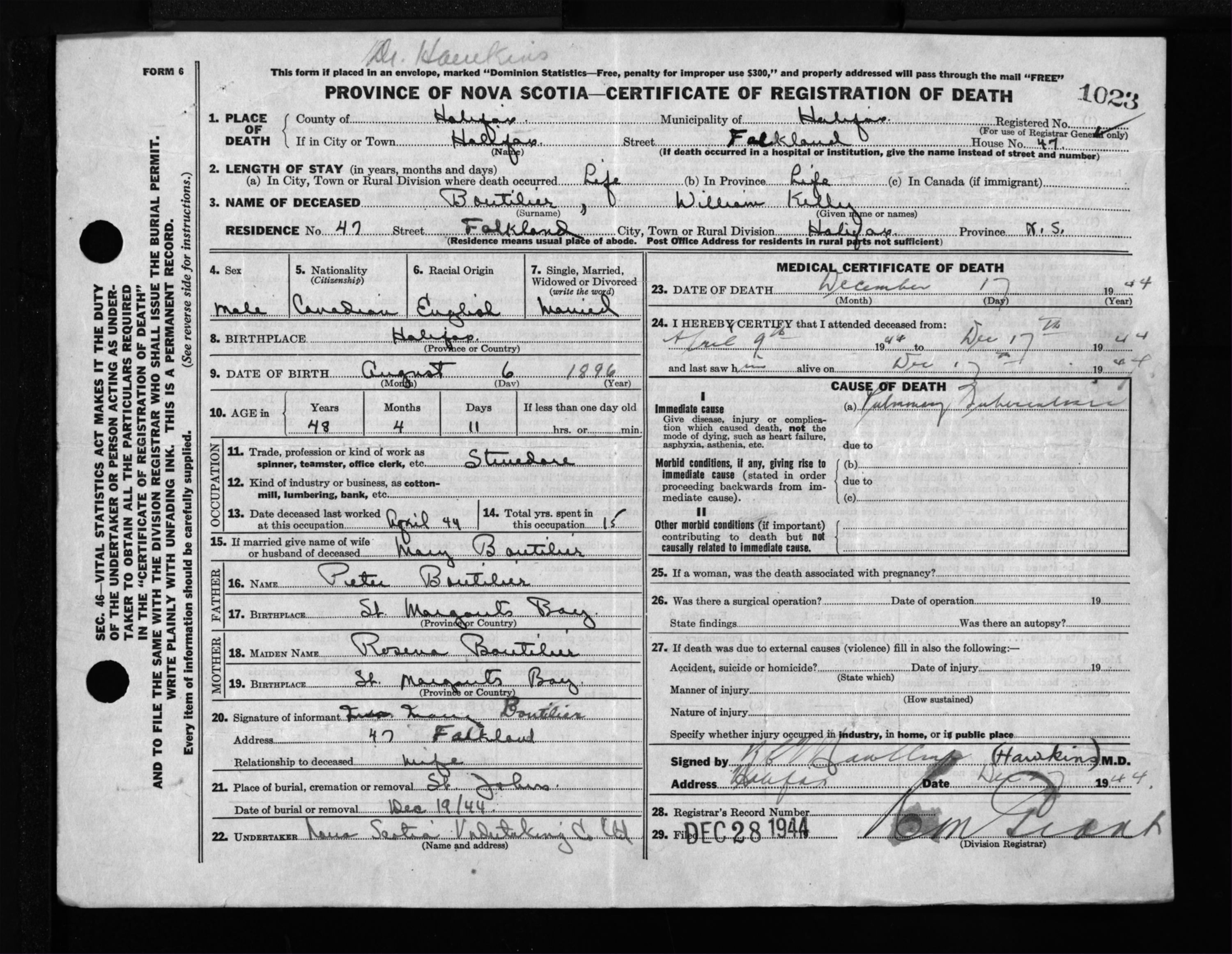 Male Death Registration: Year: 1944 file: 219 number: 1023