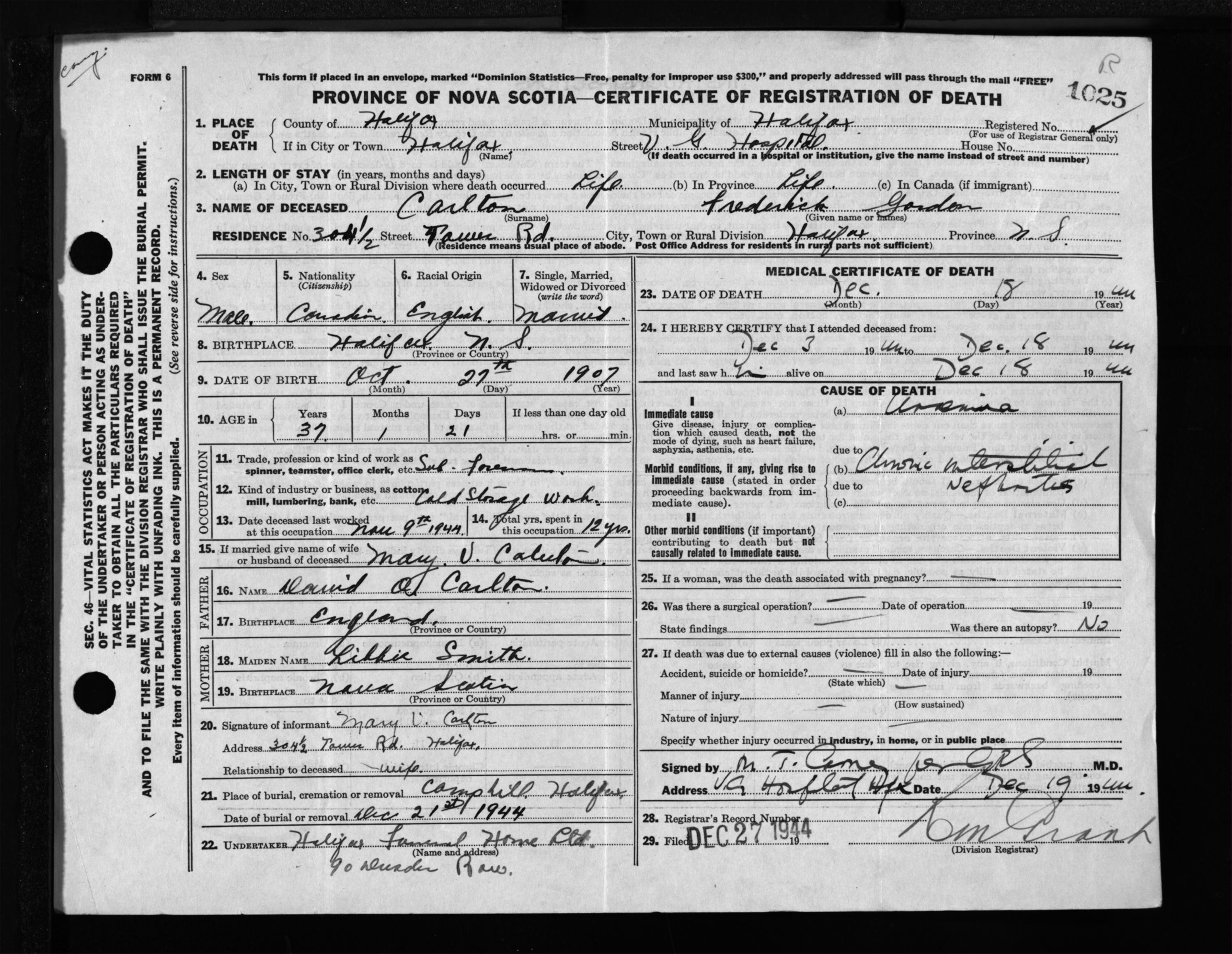 Male Death Registration: Year: 1944 file: 219 number: 1025