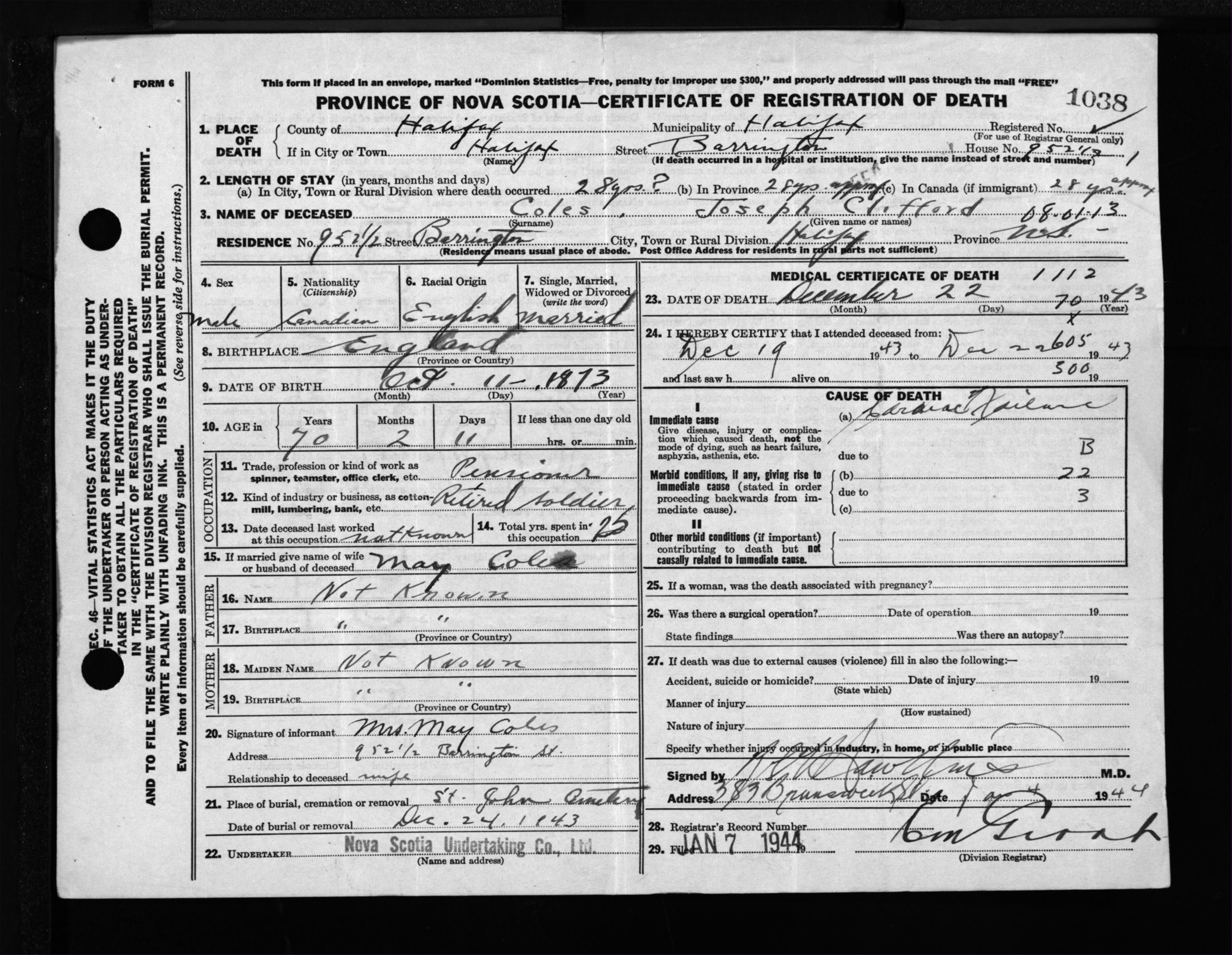 Male Death Registration: Year: 1943 file: 219 number: 1038