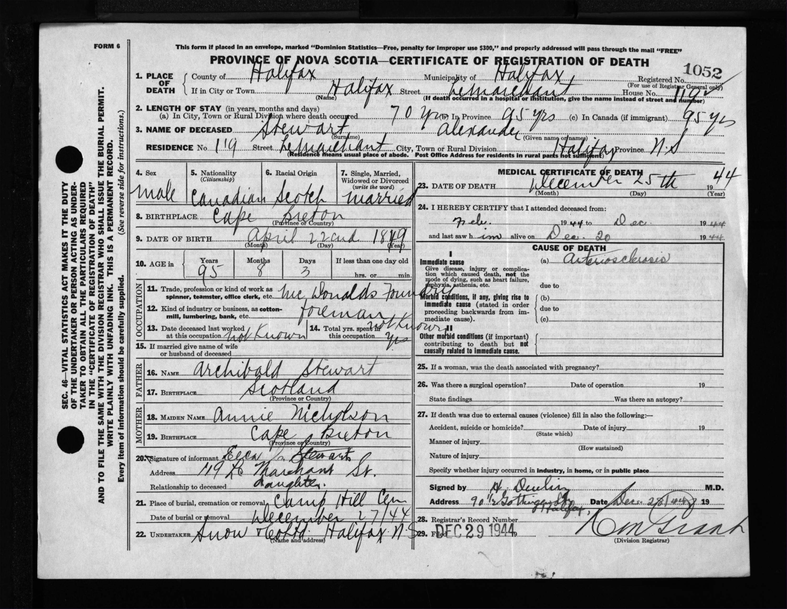 Male Death Registration: Year: 1944 file: 219 number: 1052