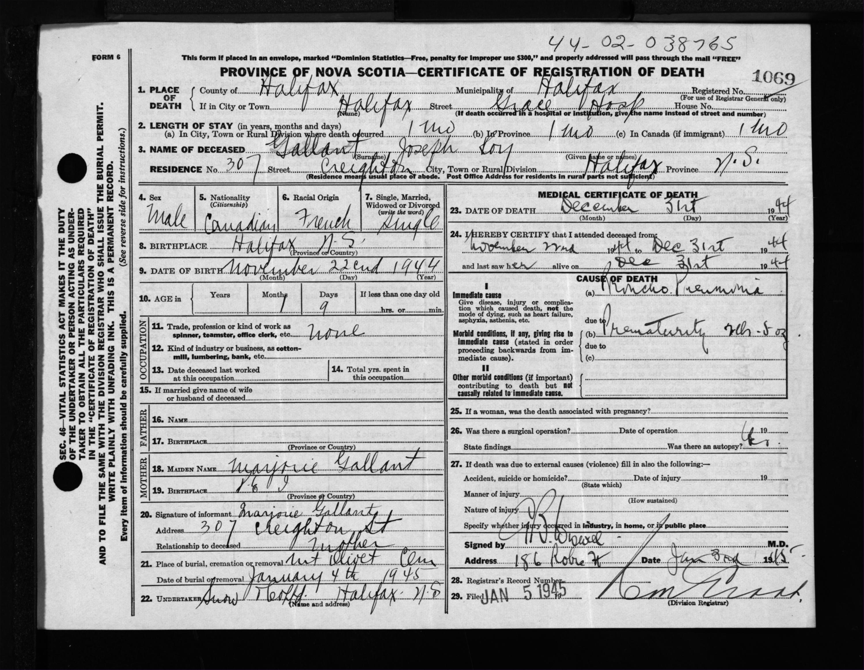 Male Death Registration: Year: 1944 file: 219 number: 1069
