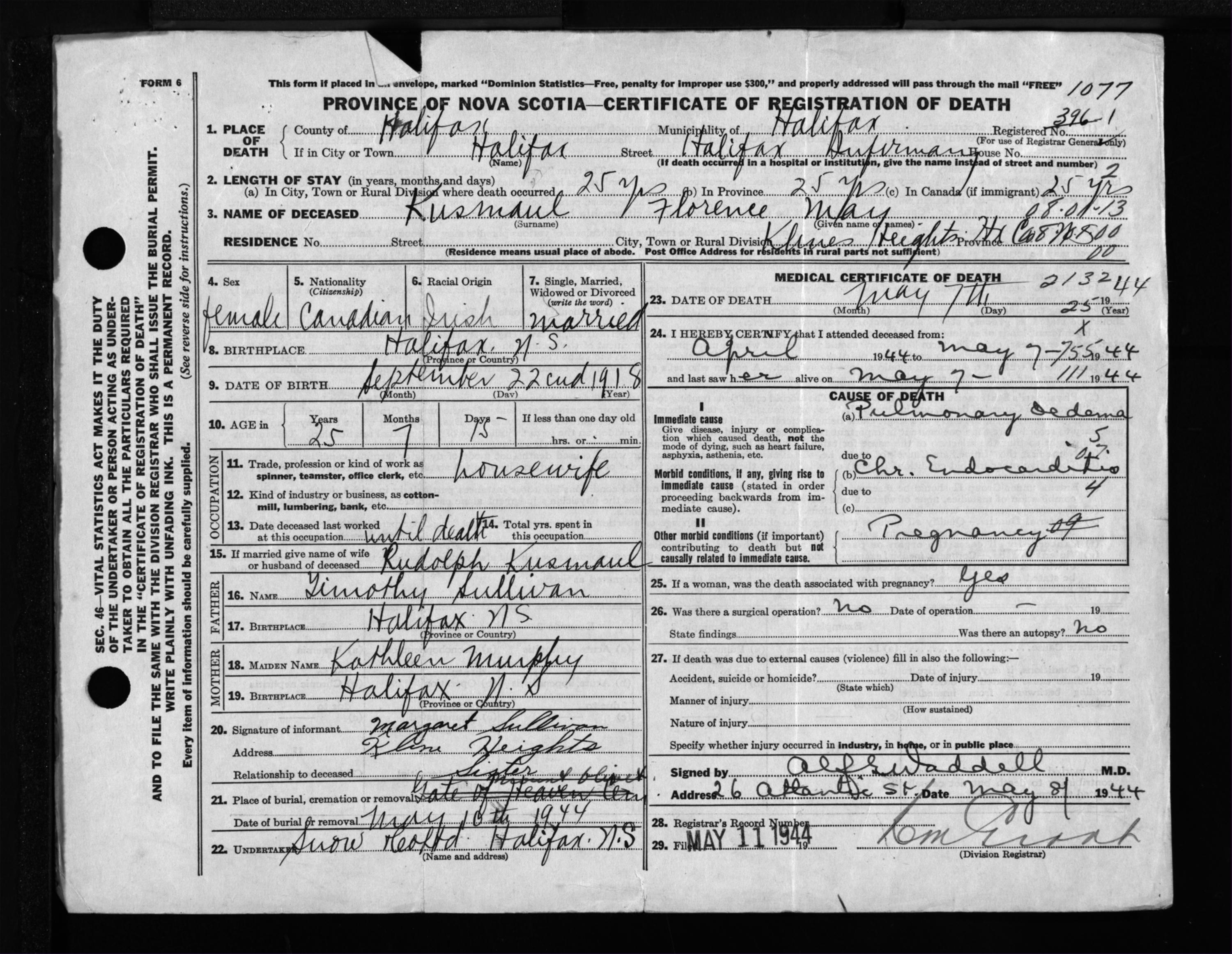 Female Death Registration: Year: 1944 file: 219 number: 1077