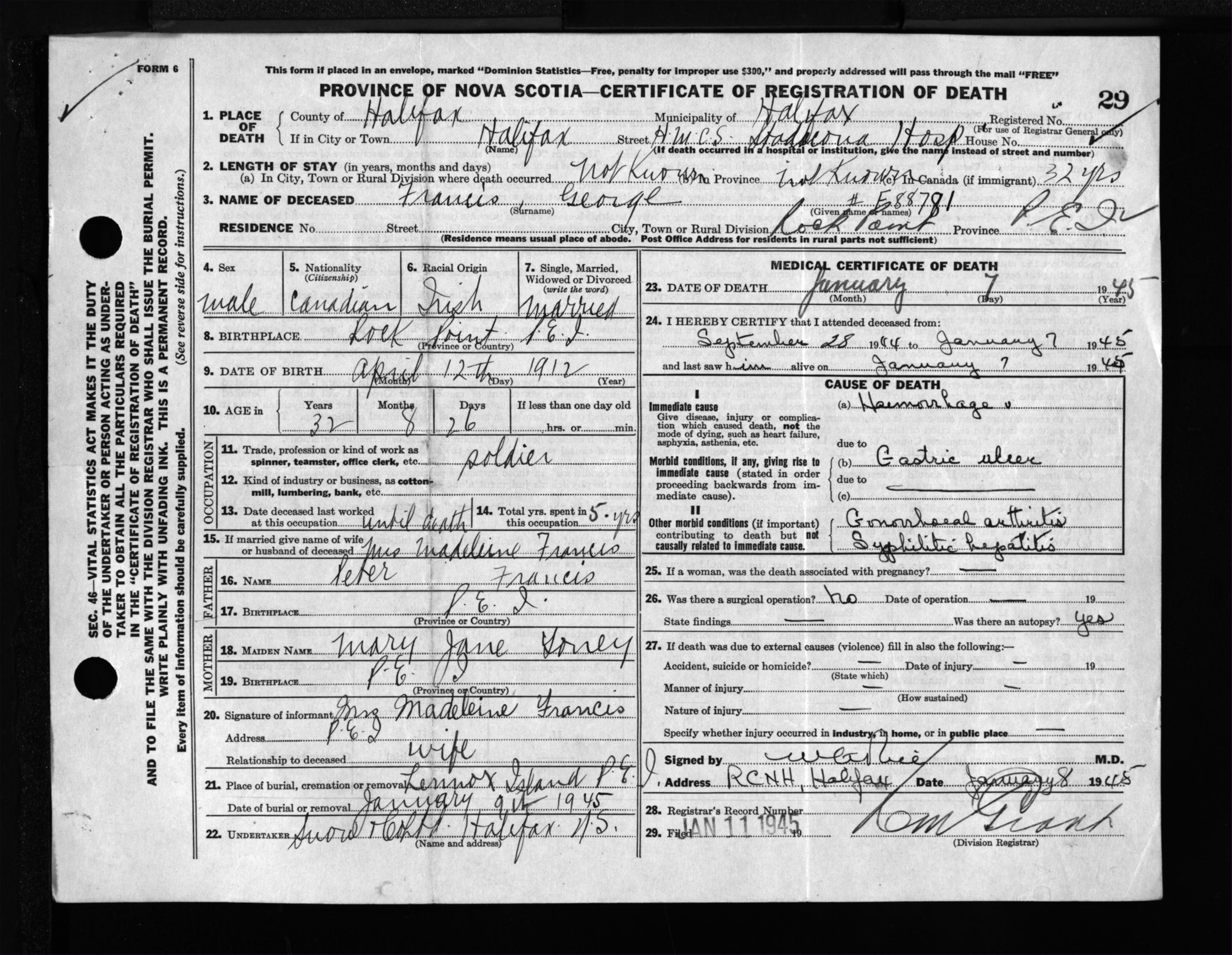 Male Death Registration: Year: 1945 file: 220 number: 29
