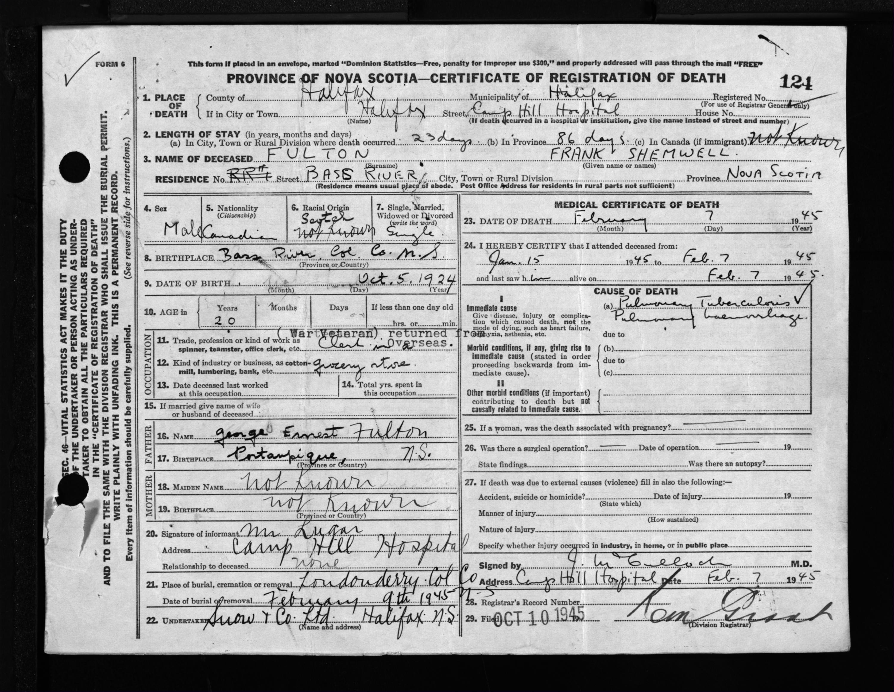 Male Death Registration: Year: 1945 file: 220 number: 124