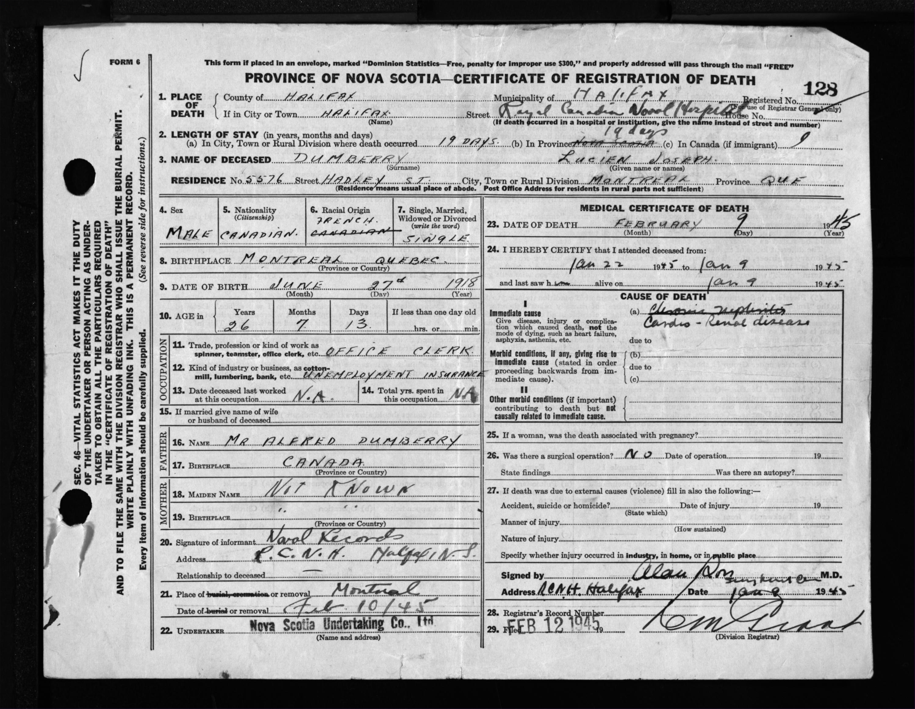 Male Death Registration: Year: 1945 file: 220 number: 128