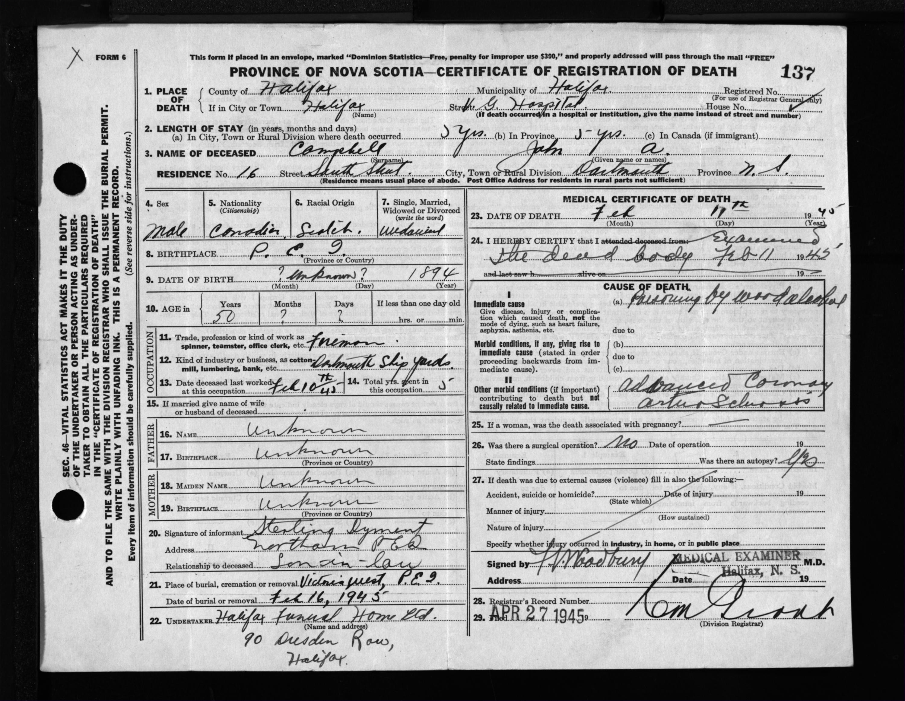 Male Death Registration: Year: 1945 file: 220 number: 137